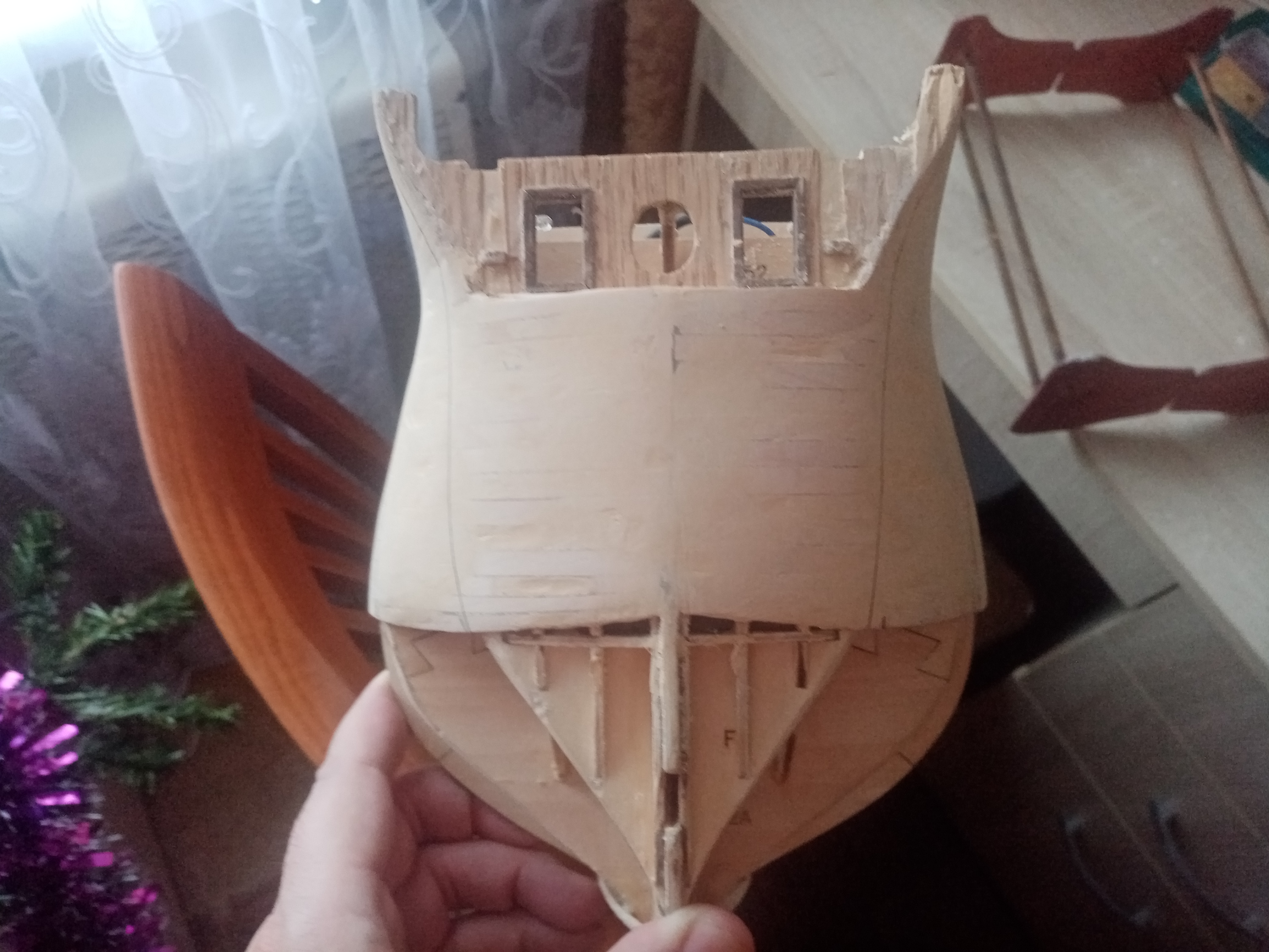 1.Эта проблема носового и кормового окончания модели легче решается если не только распариваешь рейки черновой обшивки корпуса модели но и заполняешь носовую и кормовую часть корпуса модели каким либо заполнителем. Я заполнял термозащитой от труб отопления в нашем под"езде жилого дома. Пенопласт оказался довольно твердым, легко клеится на клеи ПВА, хорошо обрабатывается острым ножом. Не плохой результат дает и МДФ. Это современный материал используемый в инд.строительстве в качестве легких перегородках жил.комнаты, что то на подобии прессованного картона. Нужно только не забыть перед укладкой реек черновой обшивки покрыть поверхность на два слоя кистью жидко разведенным водой клеем ПВА. ( концентрация жидкой сметаны ) После просушки поверхности, рейки обшивки будут охотней ложиться на свои места.Было бы не плохо предварительно подгонять рейки к своему месту. Я подгонял рейки т.н. устройством от Амати.