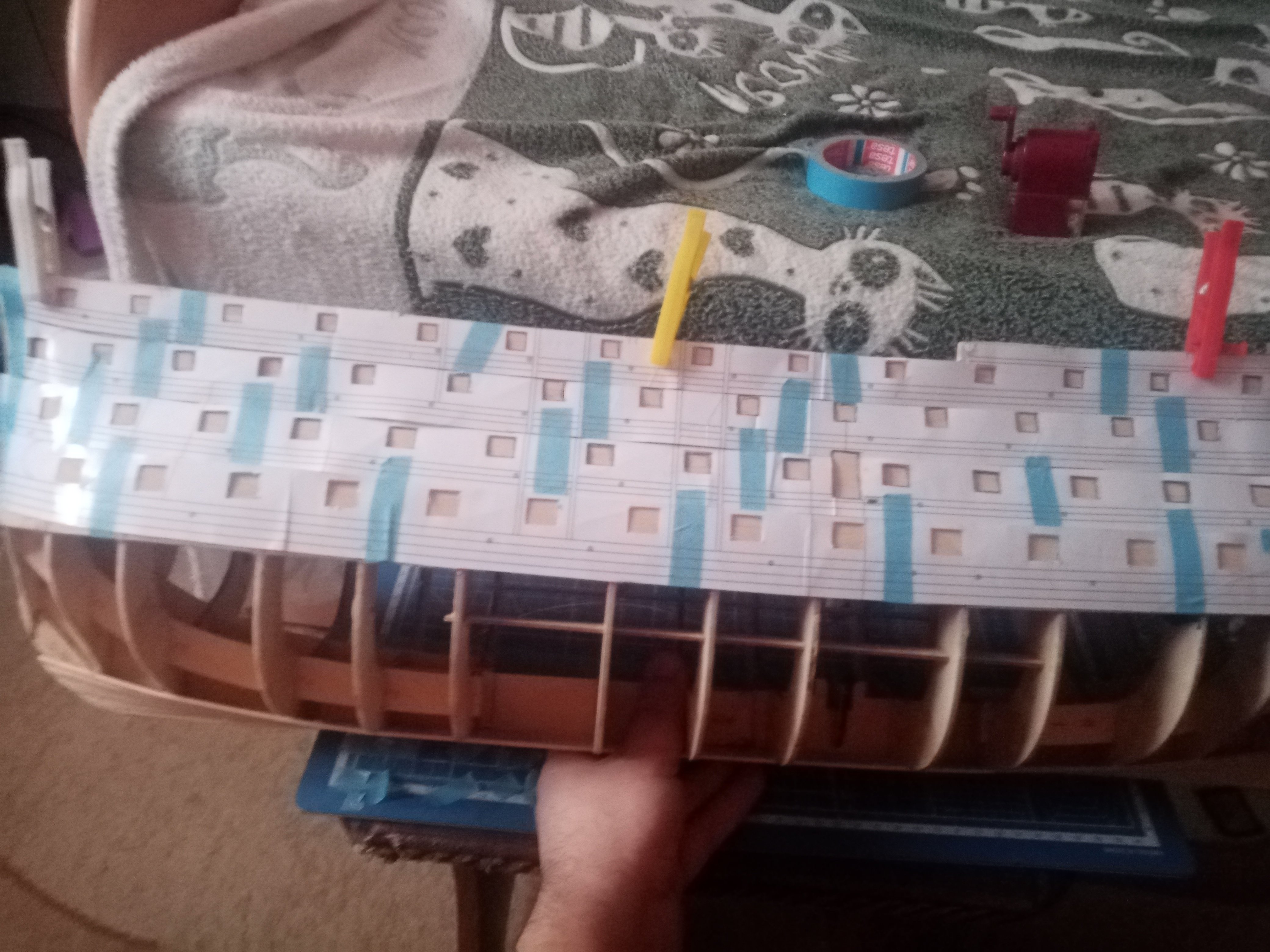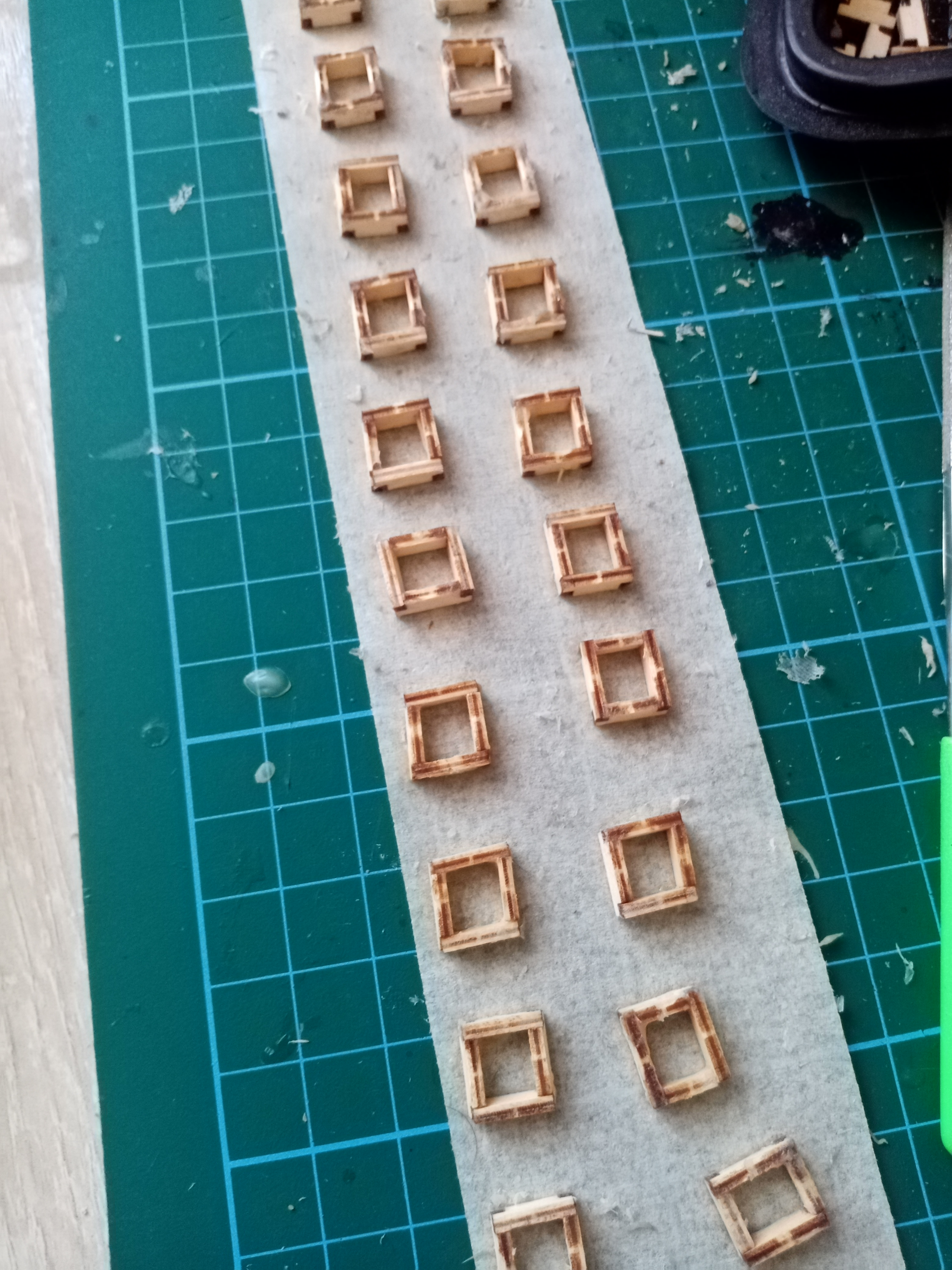 Опять засада! Где не ждал, собрвть рамки пушечных портов сложней чем их прорезать(обработать буду после высахания, собрал на малярный скотч)