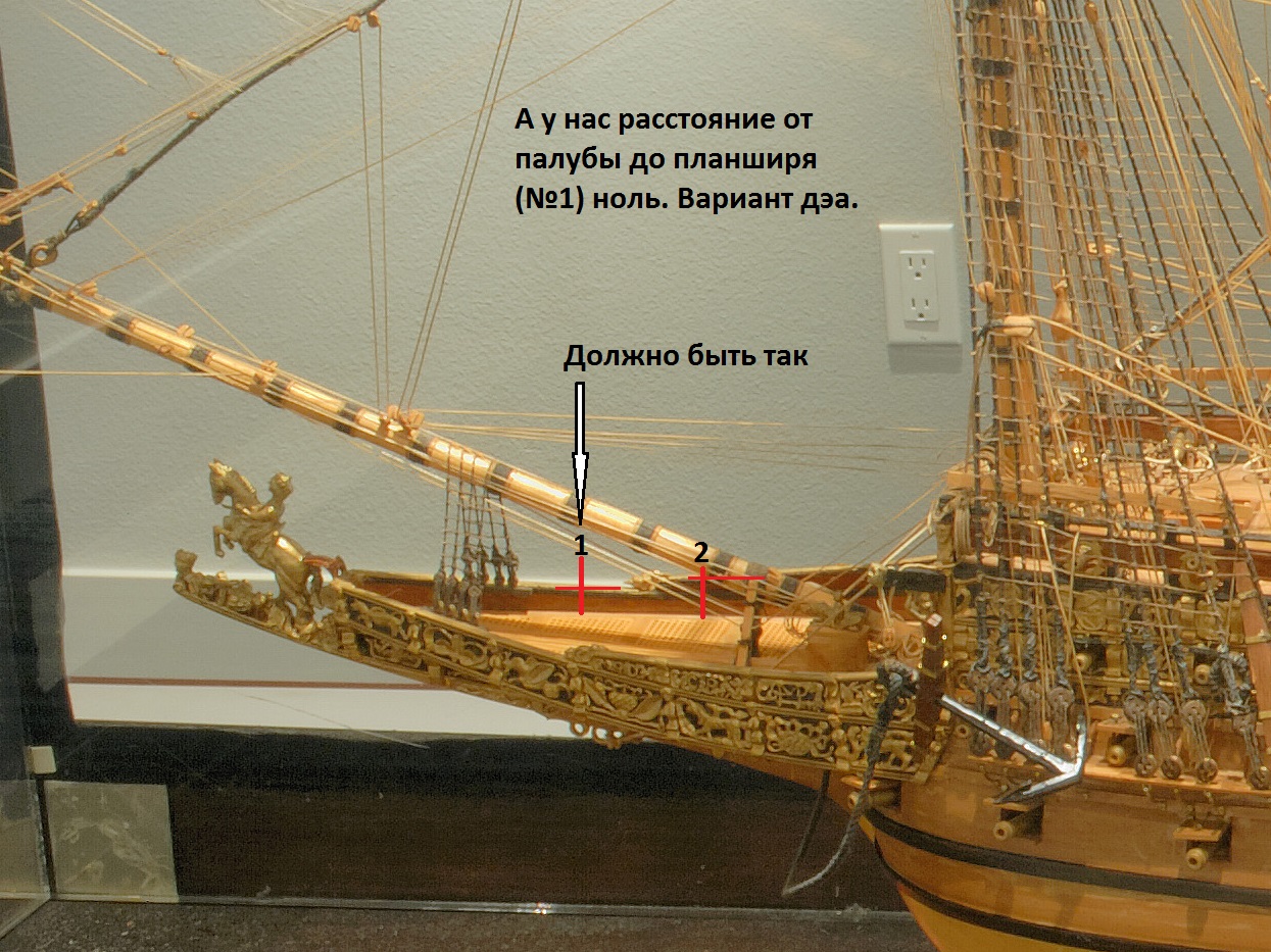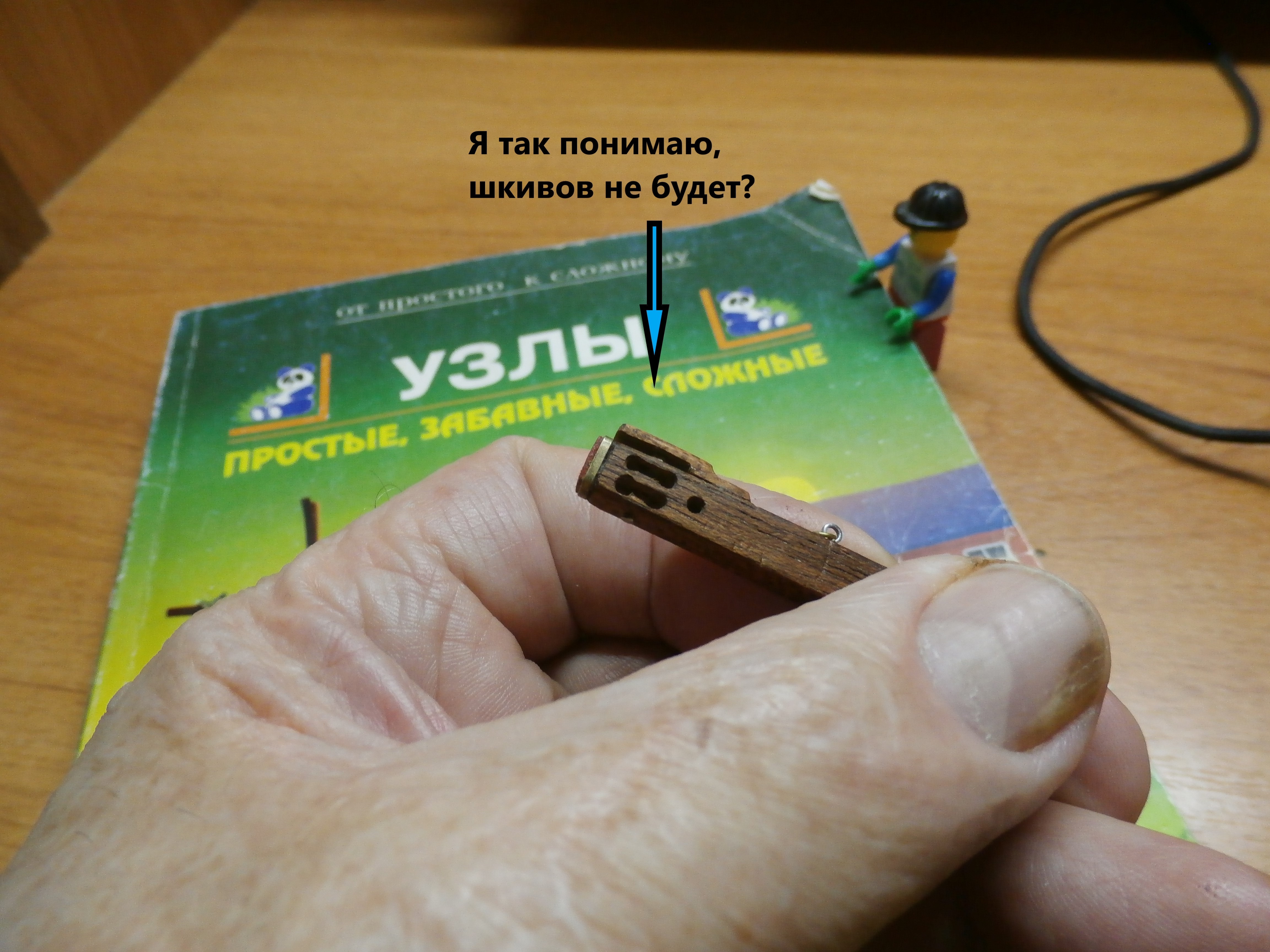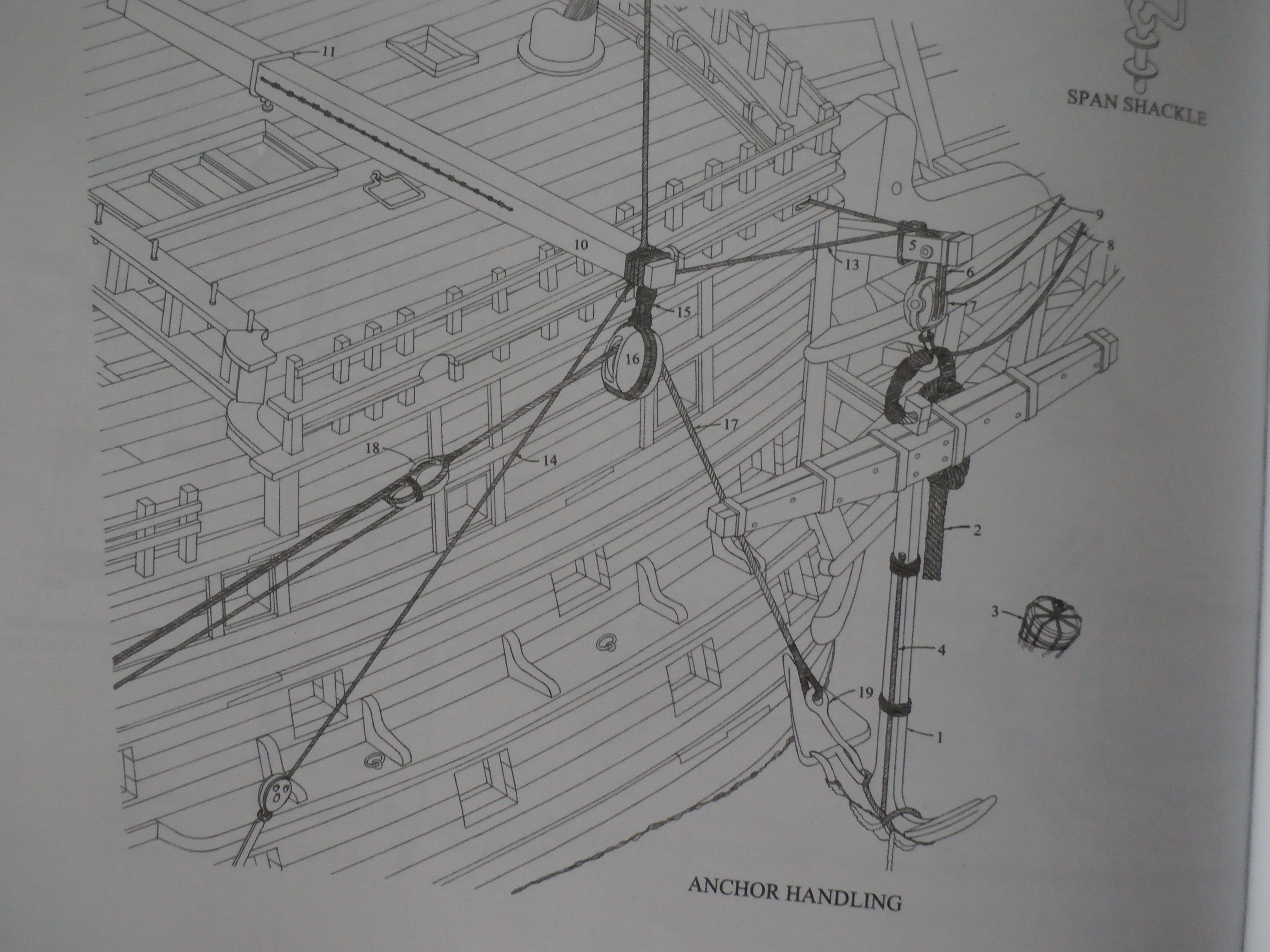Отвечаю на ваш вопрос: Вы правы, действительно КАТ-СТОПОР на КАТ-БАЛКЕ в виде не большого конца -и он только один!, Он начинается с концевого узла шаровидной формы называемого кнопом. Кат-стопор протягивается через сквозное отверстие просверленное чуть дальше шкивов кат-талей на кат - балке вертикально с верху - вниз и выскочить из просверленного отверстия кат-стопор не может за счет этого кнопа! Затем кат-стопор проталкивается матросами на подвешенном кат-талями в вертикальном положении якоре через рым (кольцо)якоря и через шкив кат-стопора (3) кат-балки (На матросском слэнге -кошка) конц кат-стопора закрепляют на оголовке тимберса. Все дело у этого рисунка - в художнике. Я не знаю его желание почему он не нарисовал середину кат-стопора не нарисовал и сам кат-стопор проходящий через шкив кат-стопора? Наверное хотел упростить рисунок, но в итоге получилась какая то не понятка. Рисунком я пользовался прежде всего для изготовления деталировки своей кат-балки а не для её такелажа. Размеры же я взял из фанерной кат-балки патворка. Удачи вам в Новом году!