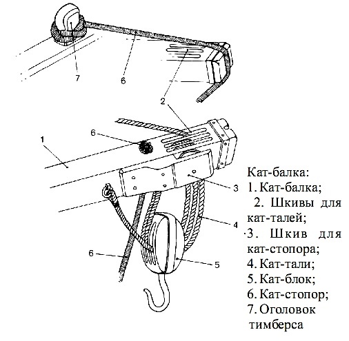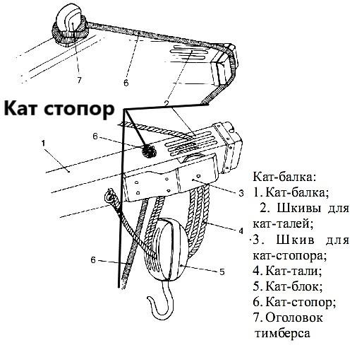 Кат-балка была нужна для начальной фазы под"ёма якоря на борт. Шпилем поднимали якорь , пока не показывался рым ( кольцо), за него закладывали КАТ-ГАК и талями якорь вывешивали под КАТ-Балкой. К этому времени на верхней палубе фок-дека установливали ФИШ-БАЛКу с необходимыми талями С помощью ФИШ-Балки заводили ПЕНТЕР-ГАК под пятку якоря вывешивали его уже в горизонтальном положении на штатное место - носовую площадку русленя.