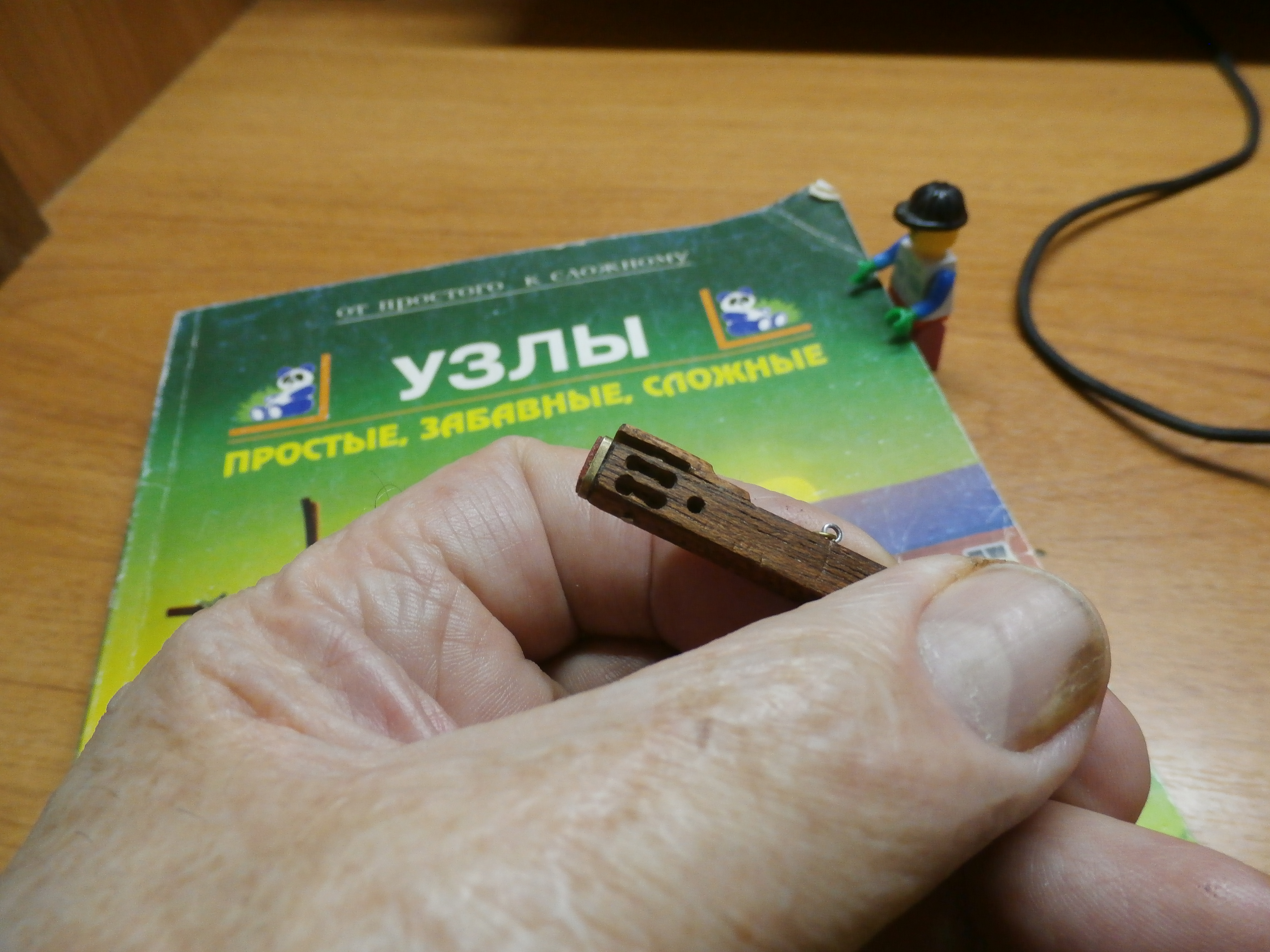 2. При изготовлении кат-балки имел намерение изготовить шкивы, даже подобрал медную трубку подходящего диаметра, но потом отказался. Отказался и от трех прорезей на кат-балке. Хотя понимаю, что это проигрывает в глазах зрителя. Во всем виноват масштаб модели. Слишком мелкими получаются детали! Если в прорези продернуть канат от кат-блока , то совершенно не будет видно данные шкивы. Если утоньшить канат, будет смотреться - не солидно!