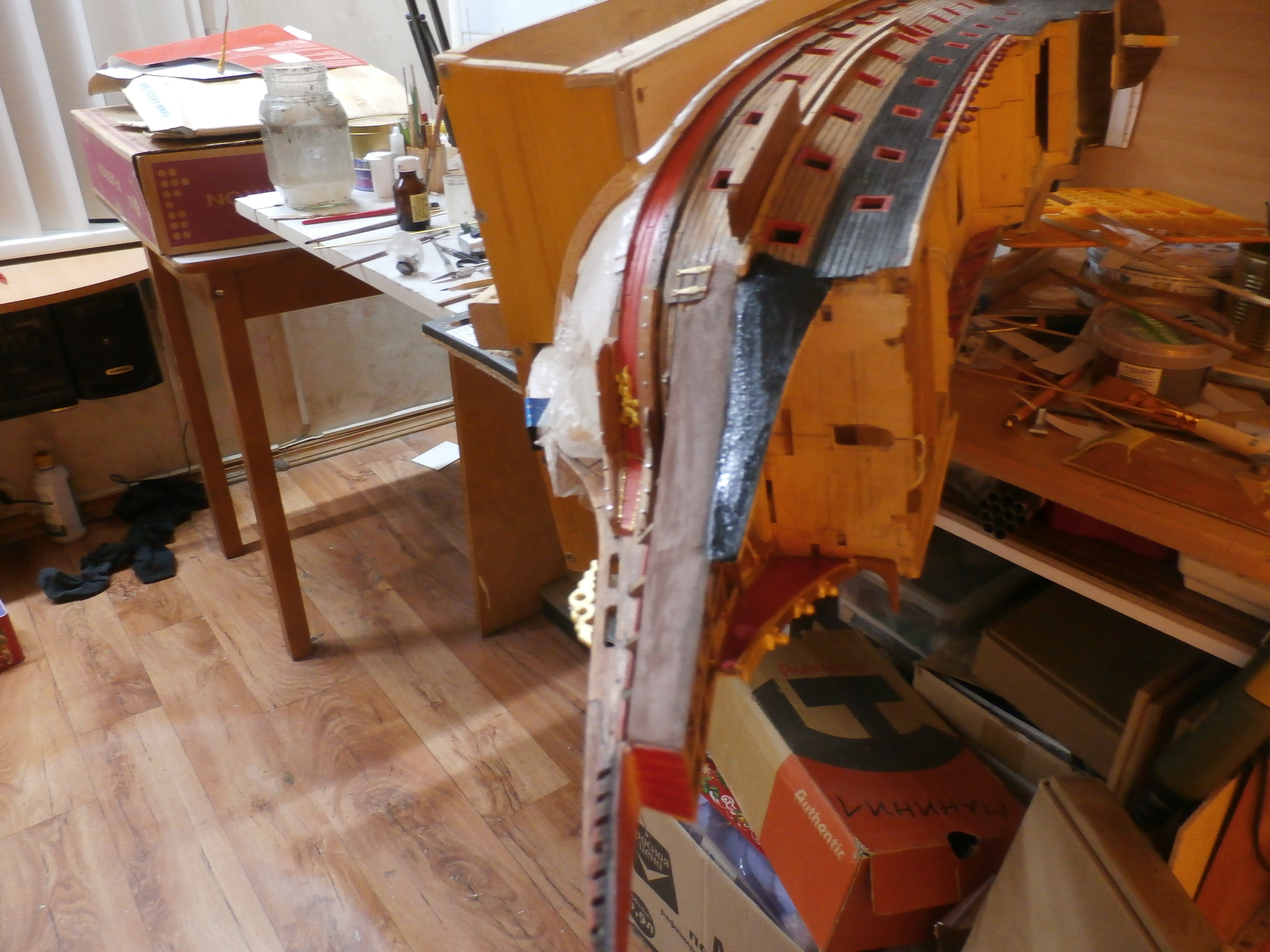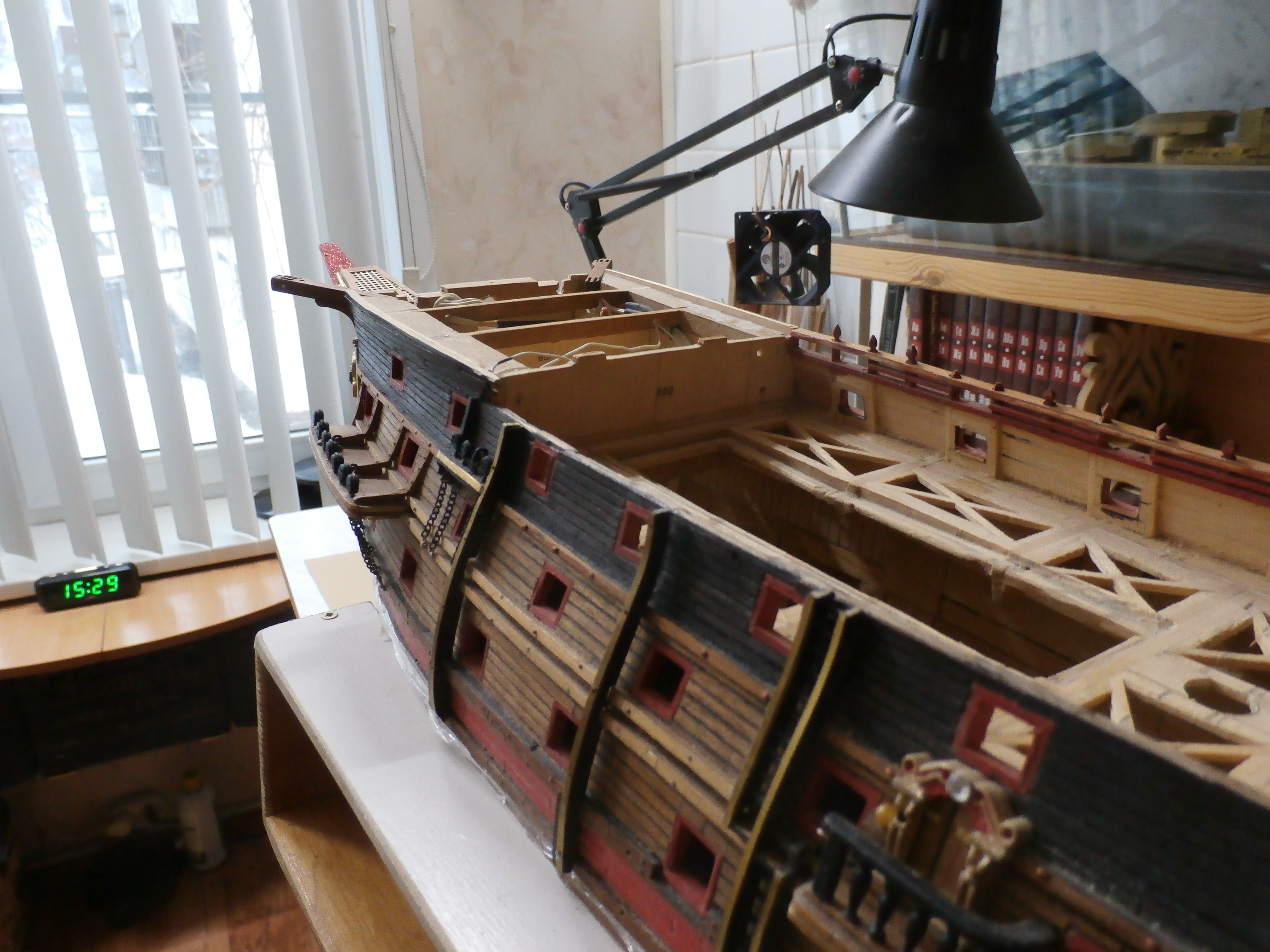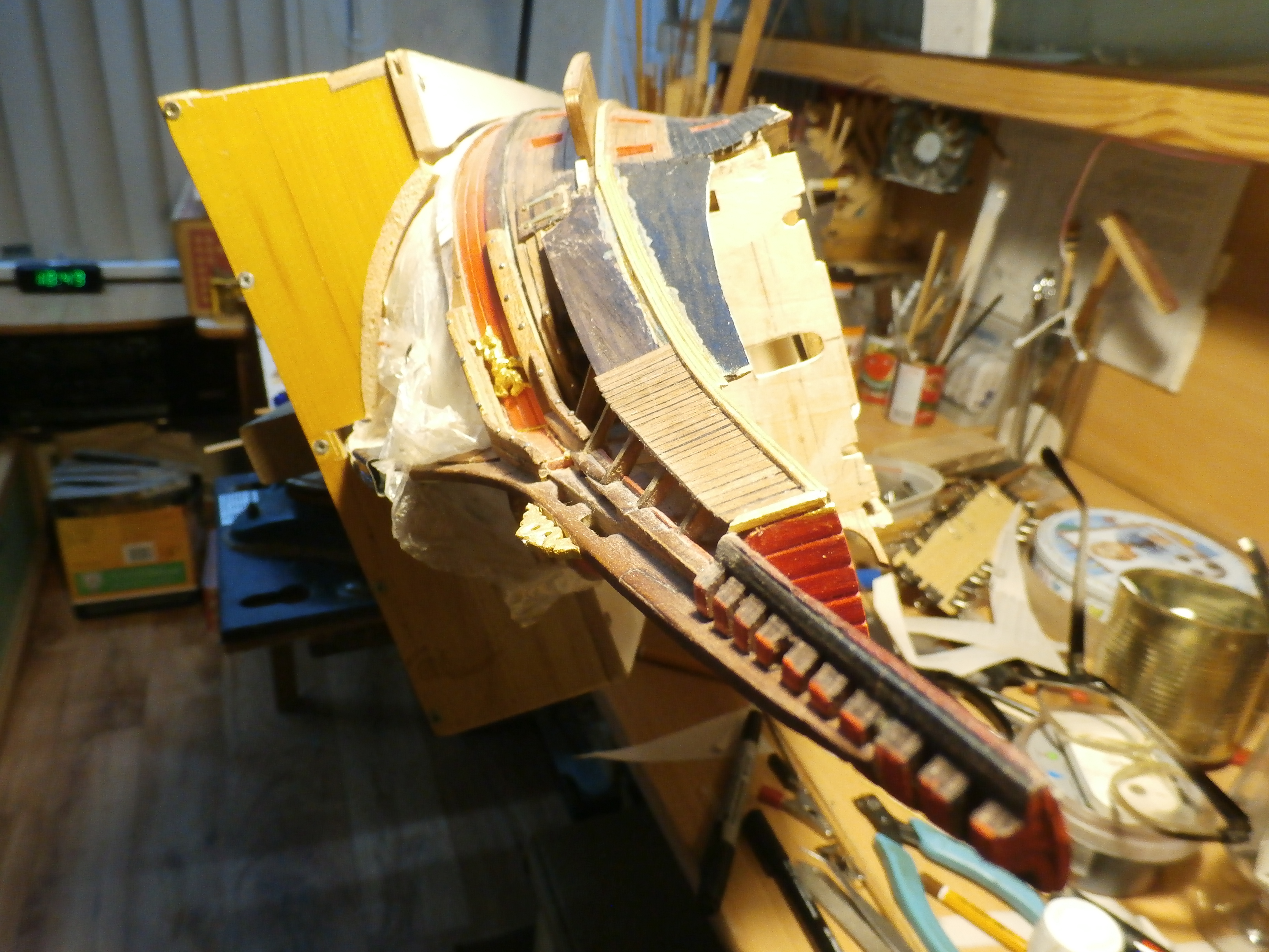 Верфь на моём письменном столе продолжает свою работу. Веду строительство английского линейного парусного корабля " Повелитель морей ". В настоящее время строительные работы ведутся в носовой части модели. Обустройство фальшбортов у гальюнной площадки модели. Основные работы по декору левого борта гальюнной площадки я закончил и сейчас приступил к правому борту модели.