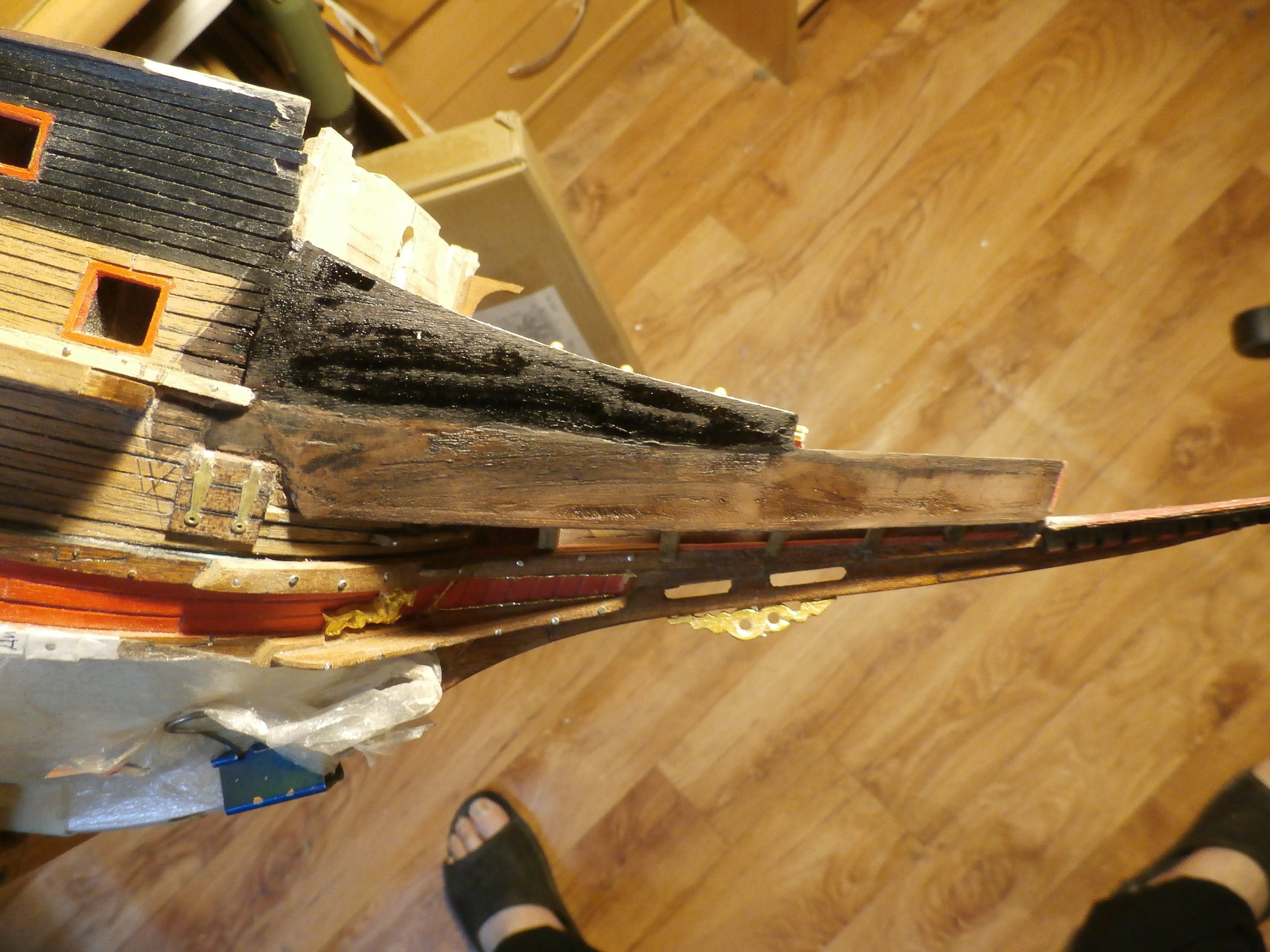 Затем поверхность фальшбортов я заморил: низ спиртовой морилкой цвета "махагон" , верх морилкой цвета: " Эбеновое дерево". По верх морилки борт покрыл жидким раствором ПВА. Морилкой фальшборт покрывал для того чтобы при поклейке реек чистовой обшивки гальюнной площадки между рейками не проглядывала чистая и белая древесина черновой обшивки борта. Клеем ПВА покрывал для того, чтобы рейки чистовой обшивки не сопротивлялись и охотно ложились на предназначенное им место.