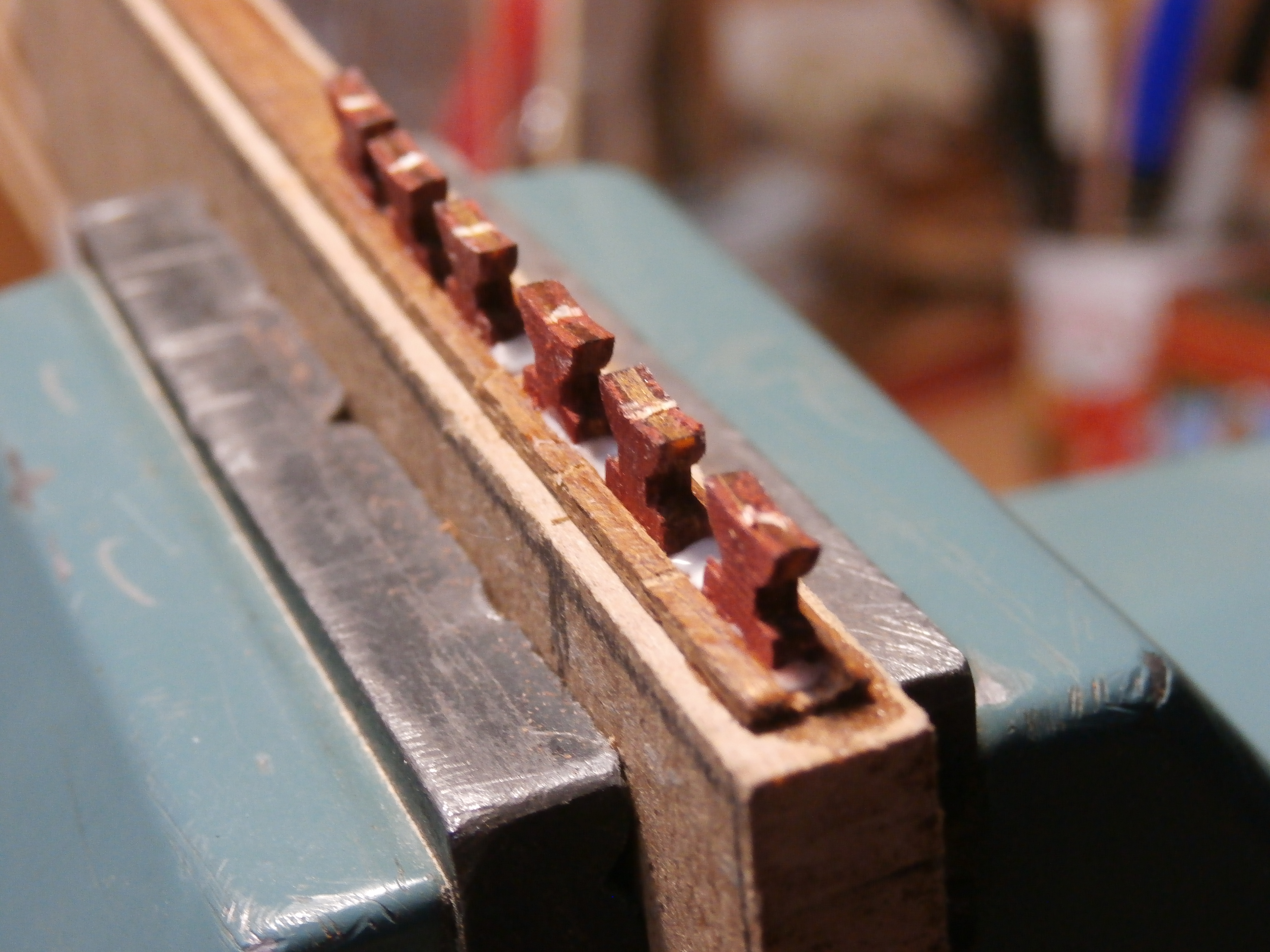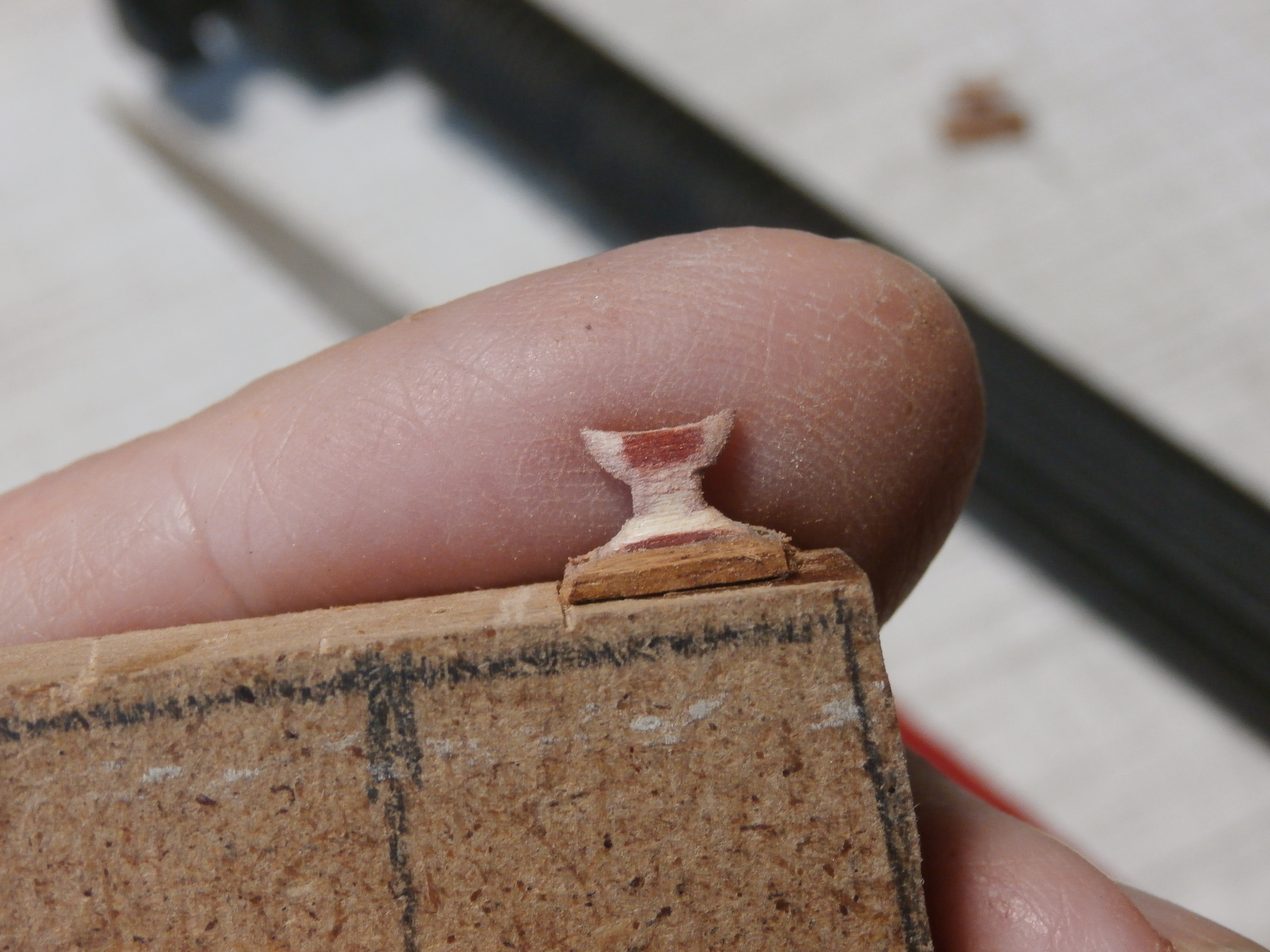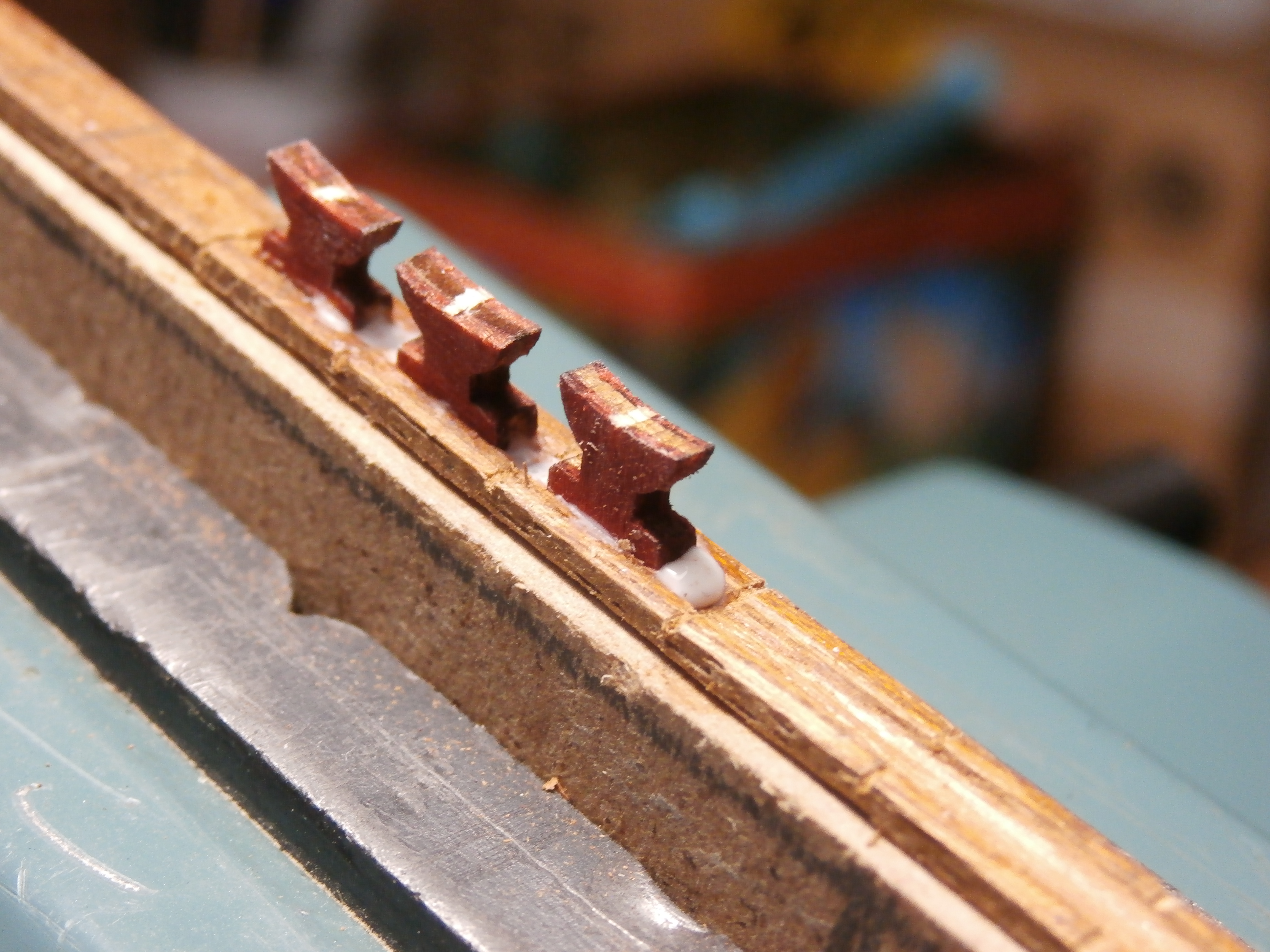 Размеры заготовки корабельной утки: Длина 6 мм Высота 5 мм. Задача у уток на моей модели это не только декоративная, но чисто и практическая. На "рогах" моих уток будут крепиться снасти такелажа модели в будущем. Для увеличения жесткости конструкции утки я прокапывал торцы фанерной заготовки утки жидким секундным (циан) клеем. Для того, чтобы увеличить площадь опоры дельной вещи я каждую утку наклеивал на 2 мм толщины рейку основание. Утку сверлил вертикально и в отверстие пропускал металлич. нагель (канц.булавку). Это значительно увеличило жесткость конструкции.Для устойчивого крепежа утки в рейке - основании на рейке провел канавку.
