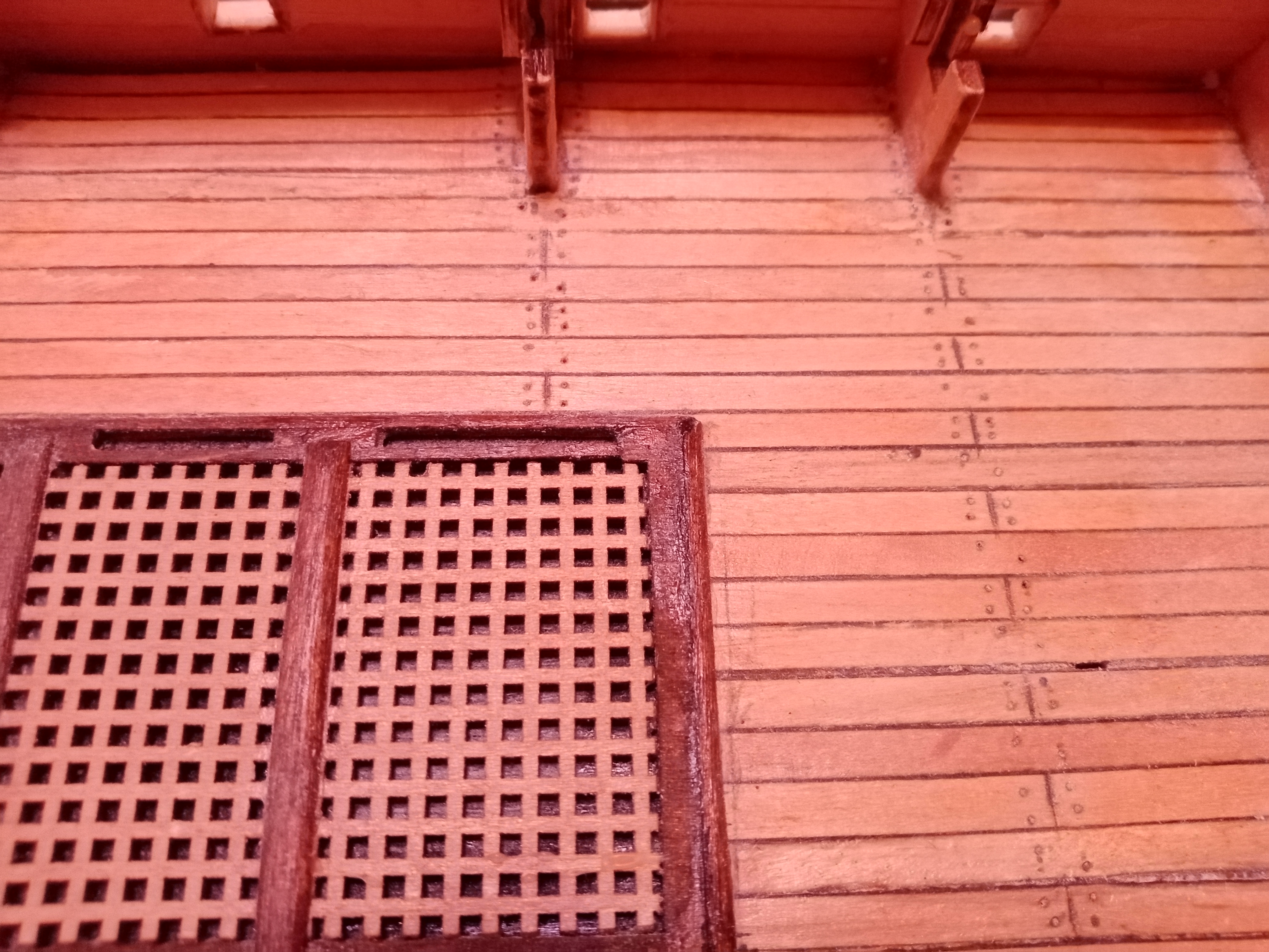На фото имитация нижней палубы. Берёза, карандаш и раскладка и нагели, ничем не покрыта. Конечно фото не айс, но другого нет.