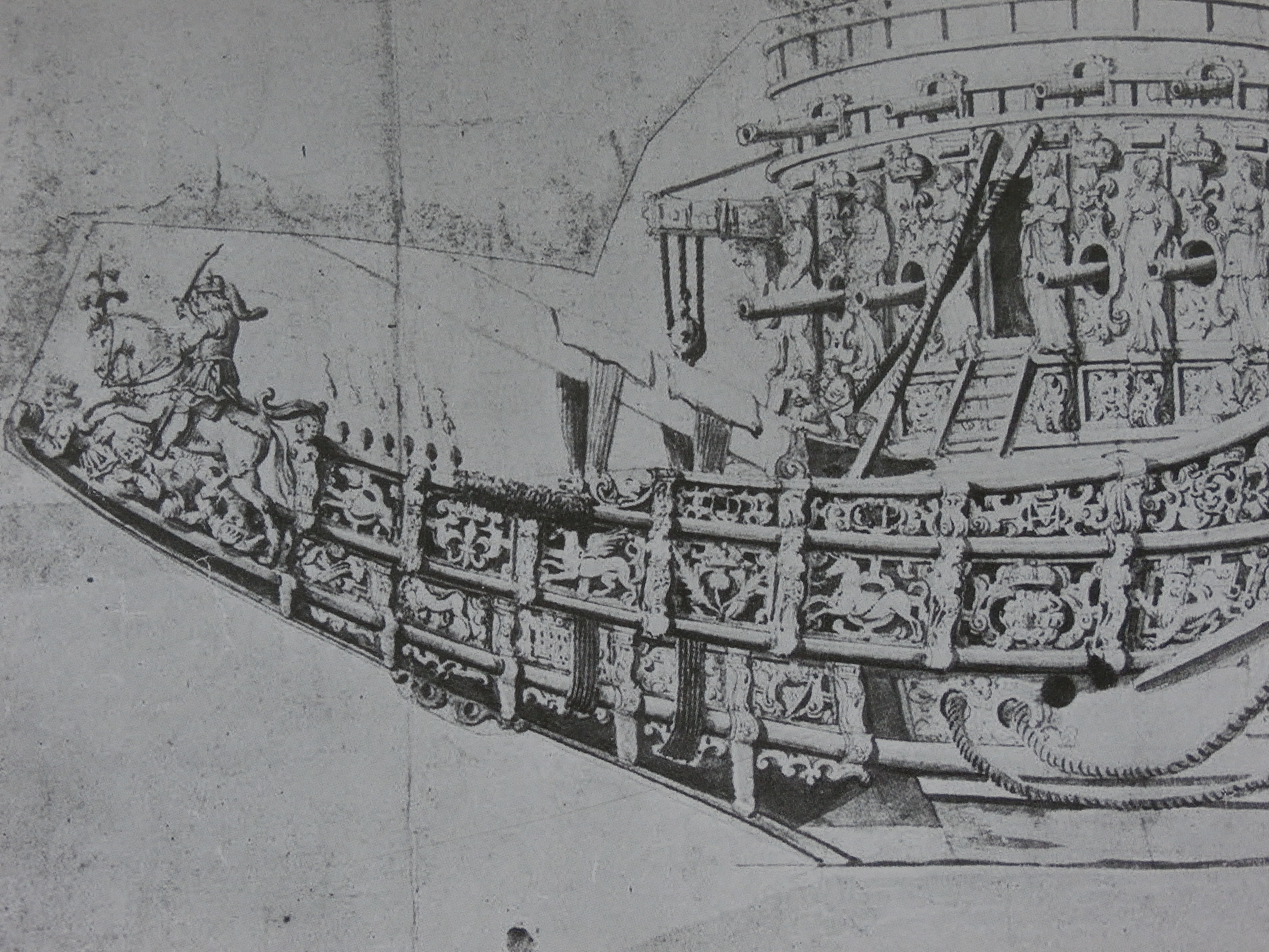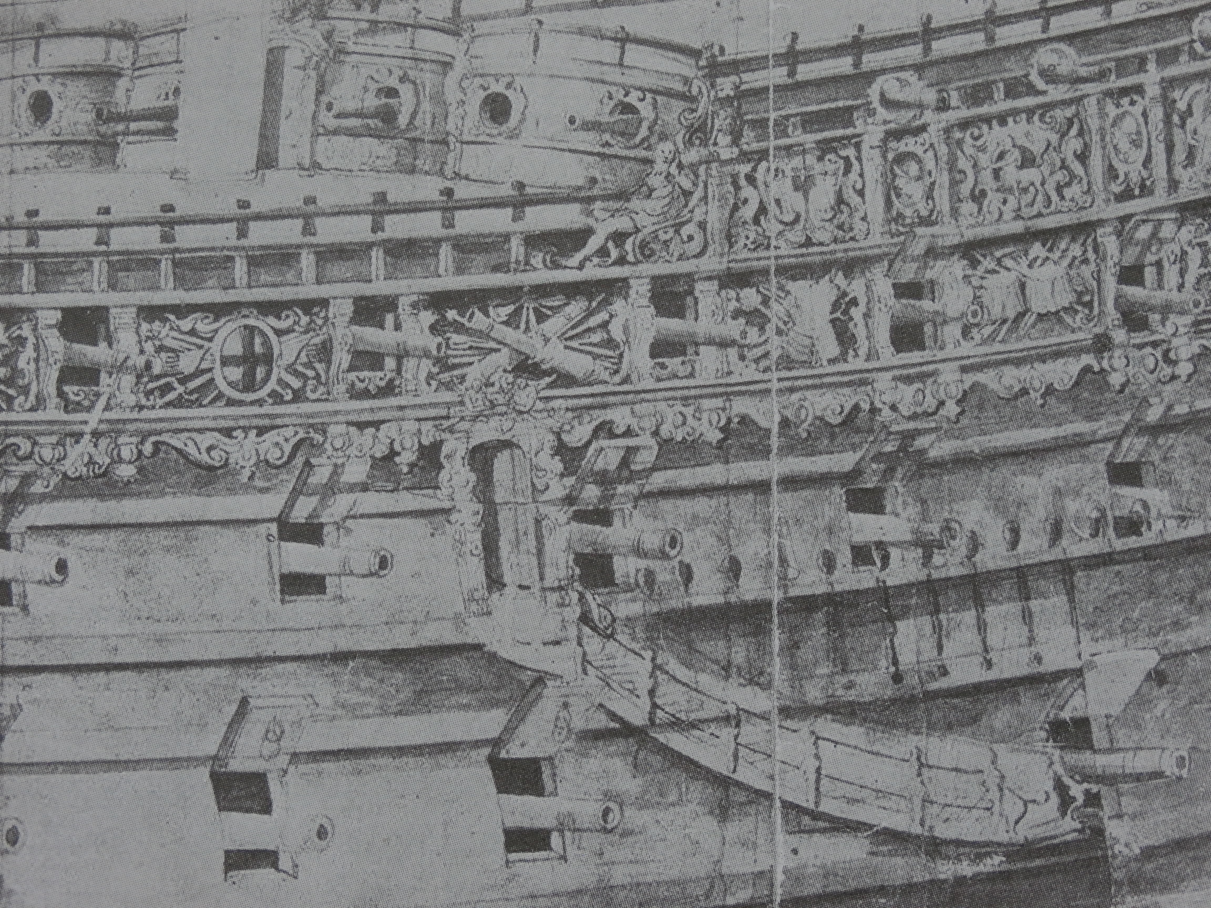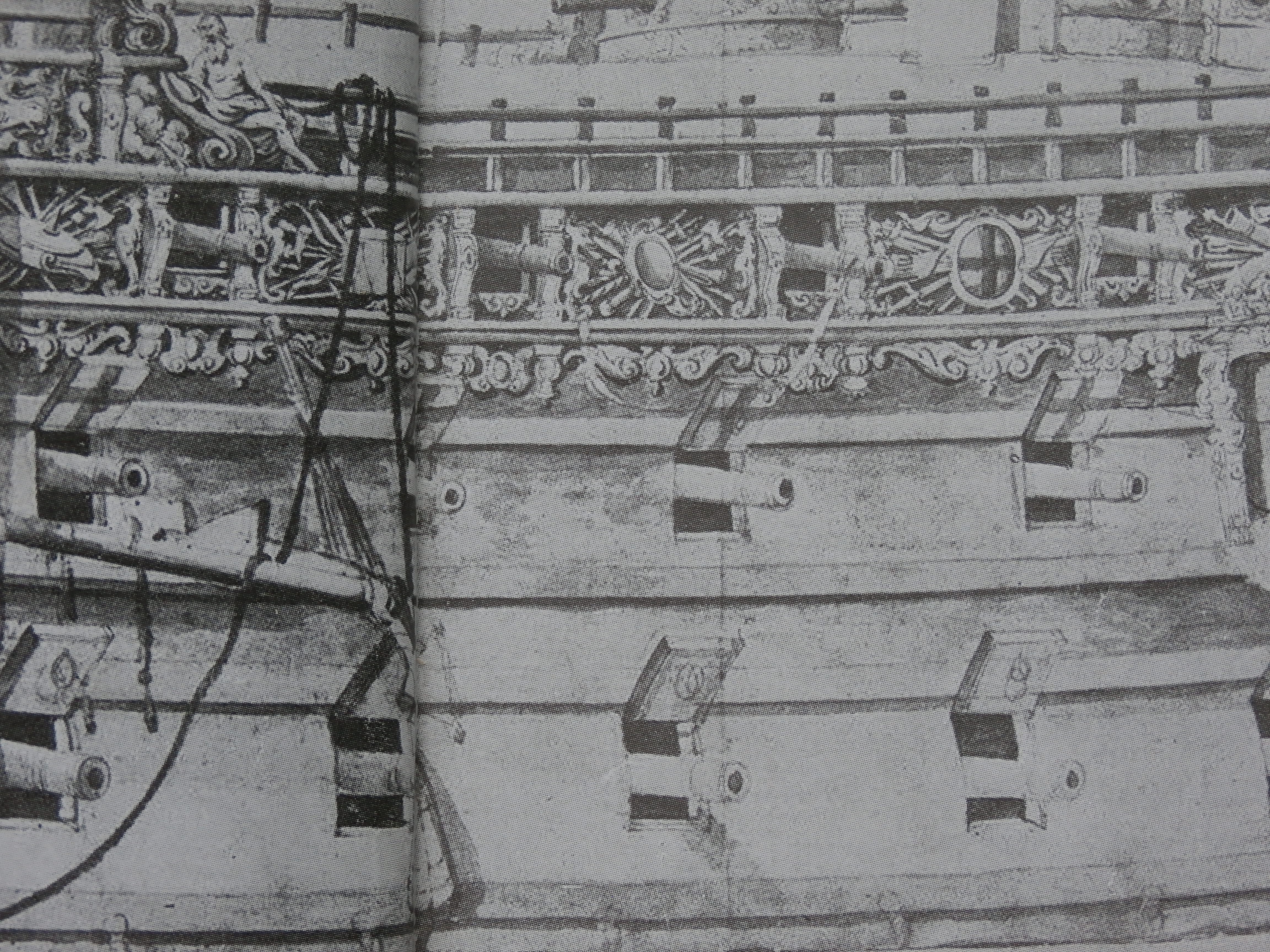 Как я понимаю, речь идет о книге Джона Мак Кейна. Я внимательно перелистал всю книгу но все рисунки и чертежи помещены на страницах книги со стороны правого борта. Видно левый борт корабля подразумевается как зеркальный - правому Есть только старинная гравюра, где изображение корабля показана левым бортом. Но к сожалению качество гравюры не слишком четкое, я сфотографировал. Удачи Вам и здоровья!