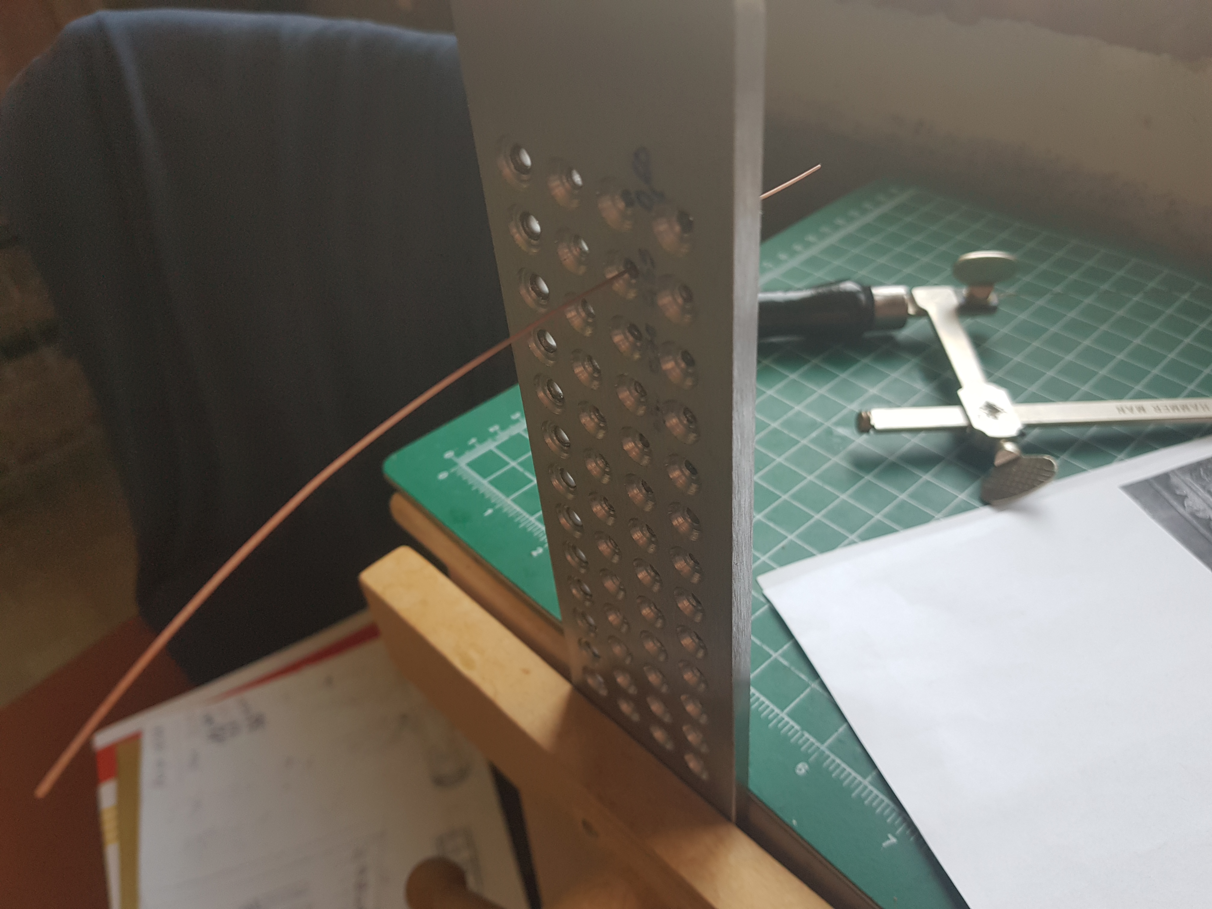 Протяжка заготовки через фильерную доску, нужно выйти на размер нагеля 0,6 мм