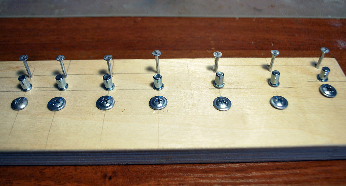 Чтобы сделать такие бухты троса потребуется приспособление, а потребовалось мне их не мало, штук 70 в двух типоразмерах 10 мм и 14 мм. Видел несколько конструкций, но решил сделать свою. В куске фанеры насверлил отверстий 6 мм под мебельные штифты для полок, вбил гвоздики и вкрутил короткие саморезы с прессшайбой.