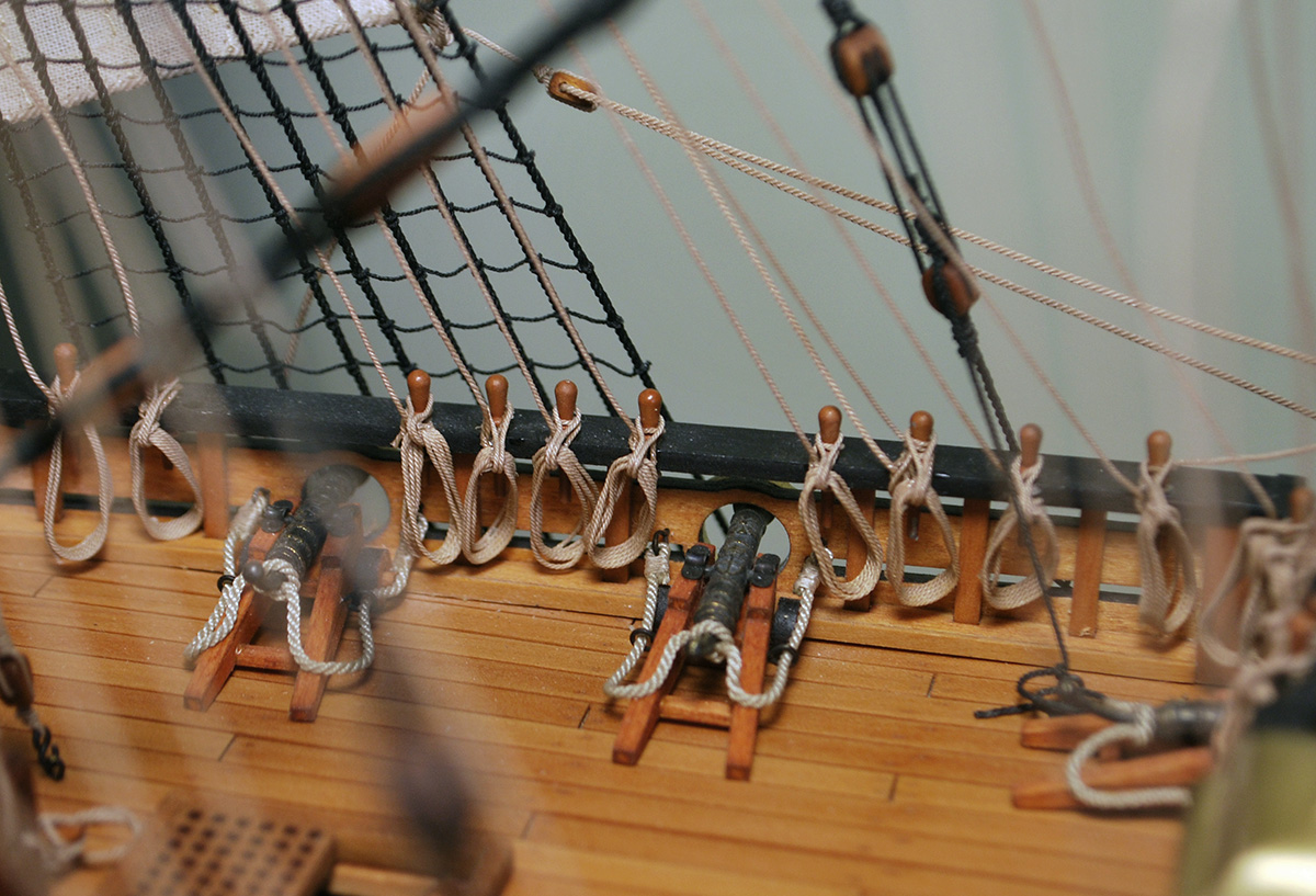 По левому борту захотелось сделать что-то поживее, как изображен буйреп на картинах, подвязанный к топтимберсу и свисающий вдоль борта. Много раз смотрел на рисунок Ван де Вельде и не видел томбуй, пока не понял, что надо искать.
