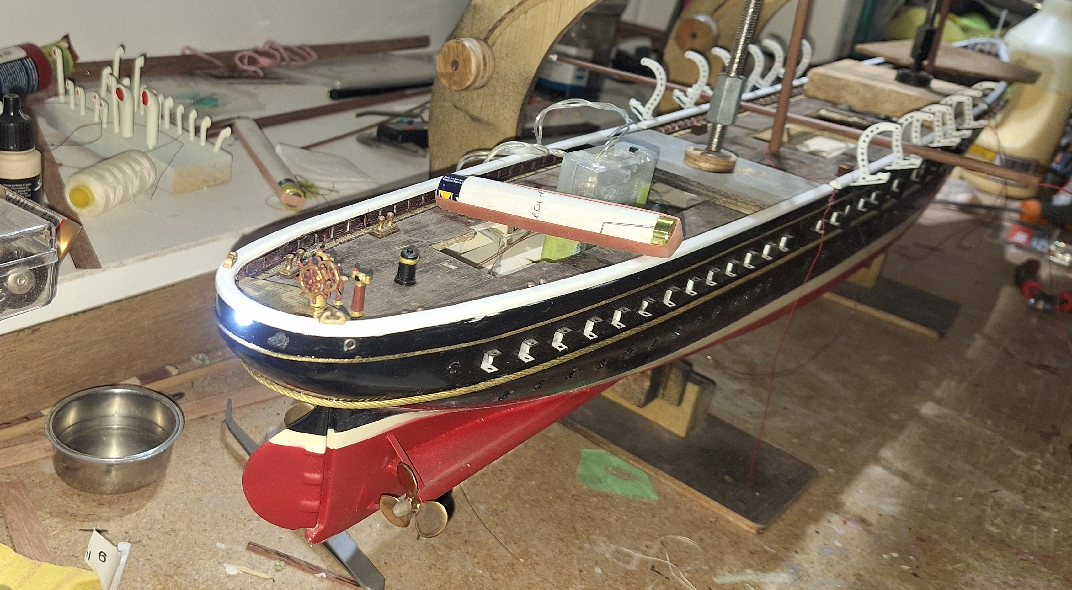 Так как баковый и кормовой огни придумал ставить после того, как установил планширь, пришлось провода прятать под него и сверлить палубу (Баковый ещё не доделан)