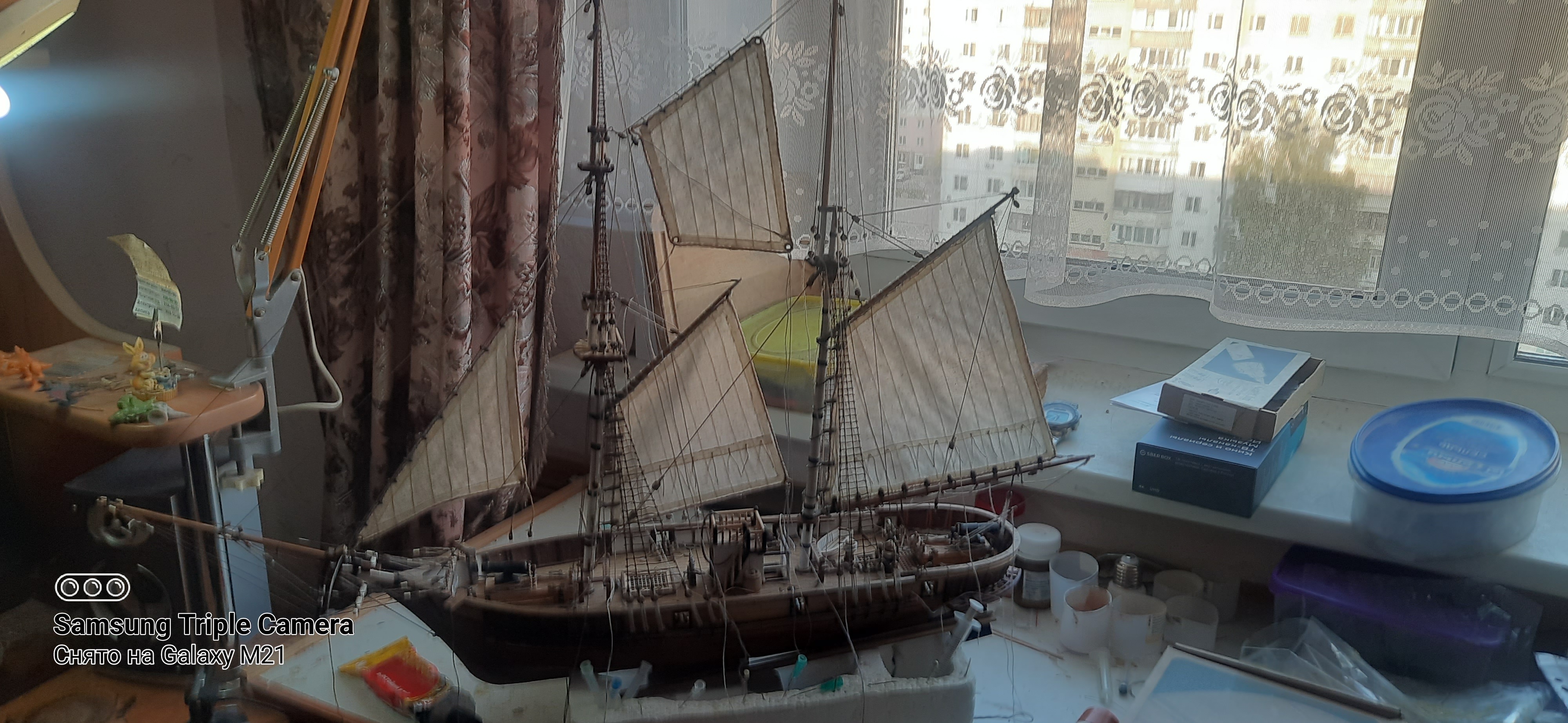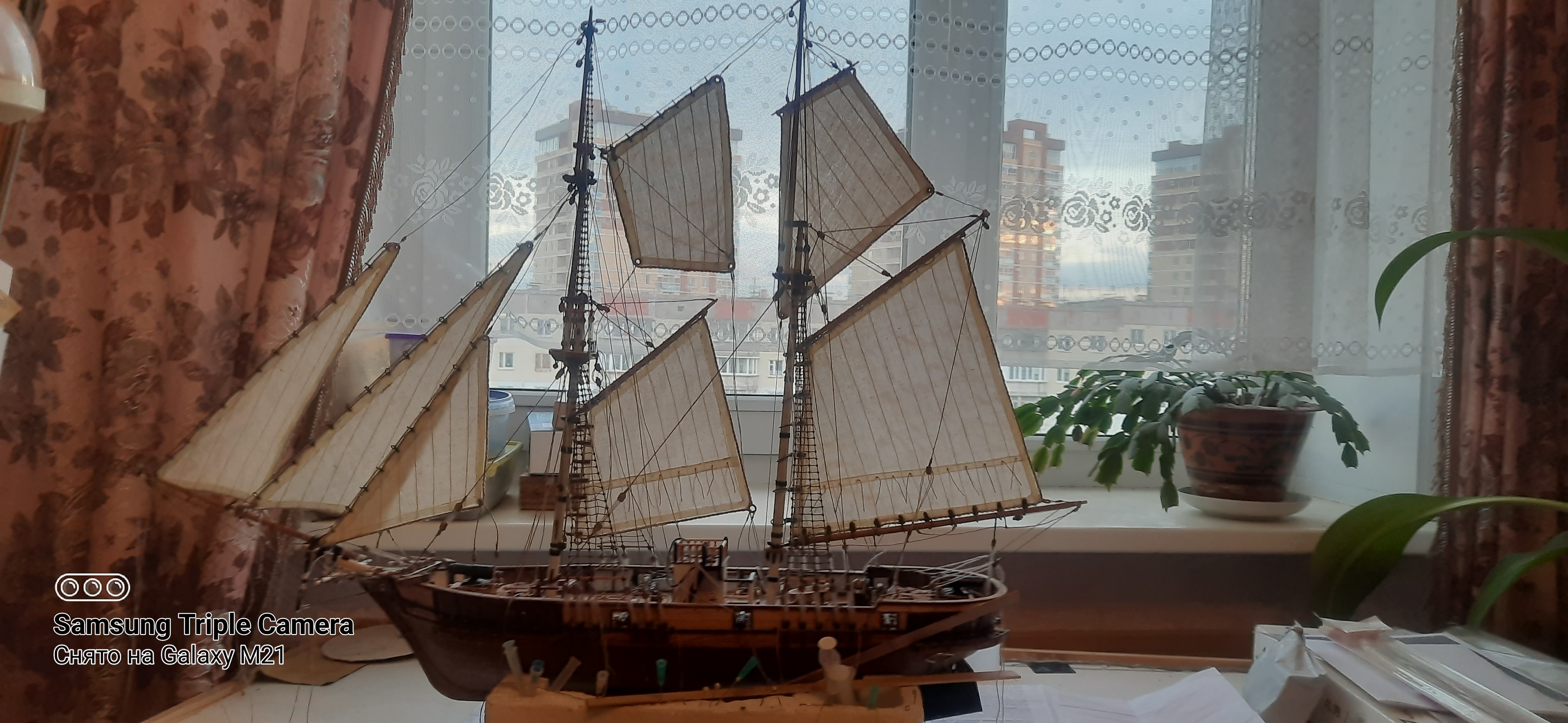 Чёт разочаровался я в патворках, с их непредсказуемо плохим (мягко) качеством и не очень уважительным (мягко) отношением к клиентам.Особенно это проявилось у ДеА. Предпочитаю КИТы. Но цены.....цены мне пенсионеру не подвластны. Вот и возникла техническая пауза на моей верфи. Но благодаря моему хорошему товарищу и коллеге по увлечению паузу удалось заполнить. Подарил он мне китайский КИТ, модель бригантины "Гусар" 1848 г. постройки.Надо сказать, что 1848 г. это конец эры парусников, и даже на модели видно каких высот достигло мастерство постройки этих кораблей. По моему она (бригантина) выглядит прекрасно, хотя не все паруса я ещё навесил.