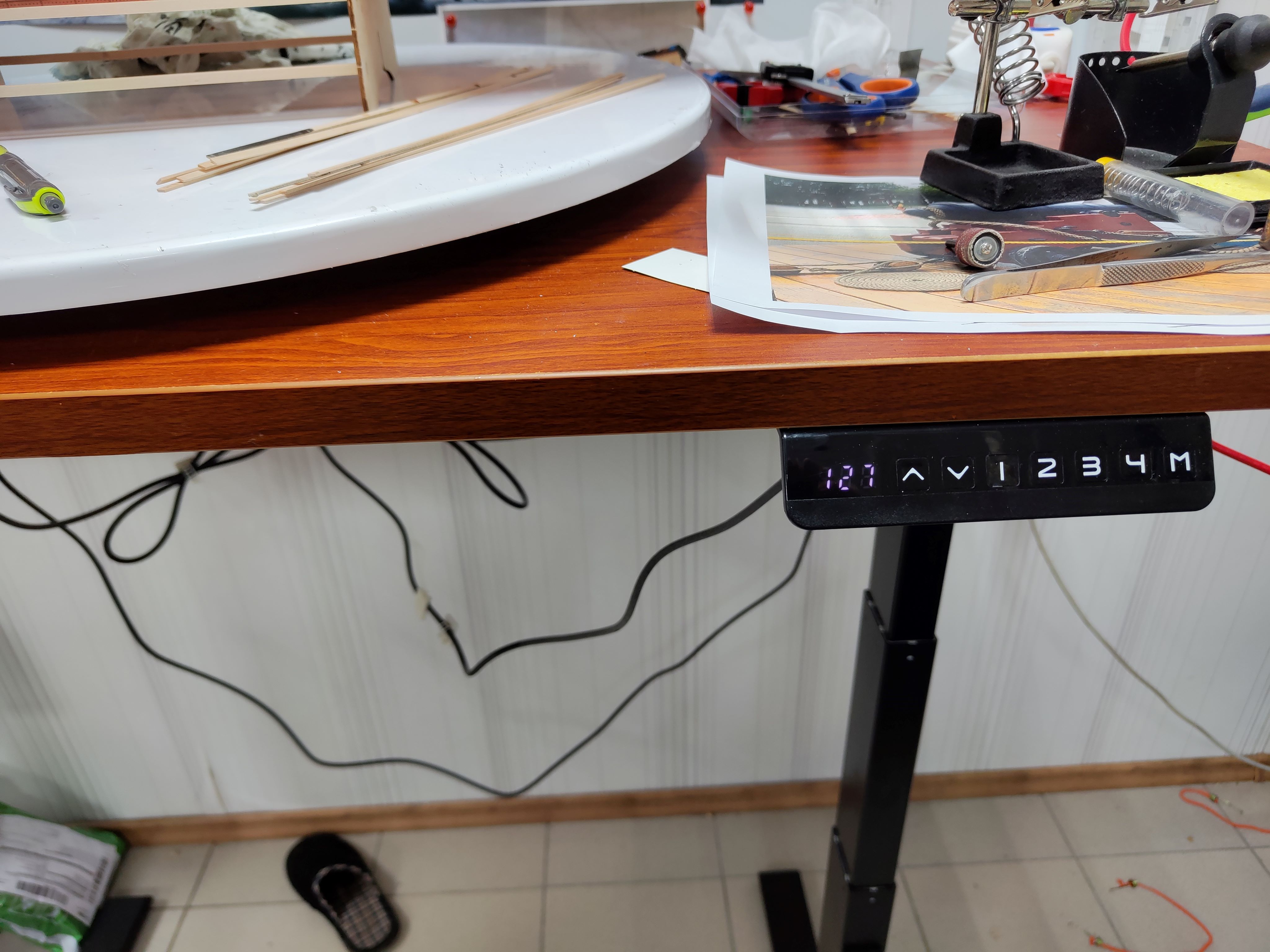 Добрый день уважаемые коллегии по постройке линкора "Сантисима Тринидад". Так как многие уже приближаются к изготовлению такелажа, где придется "лазить" по мачтам от палубы до клотика, то я приспособил компьютерный стол с регулировкой высоты от 62 см до 127 см. Изменение высоты производится с помощью встроенных электромоторов. Дополнительно для вращения в горизонтальной плоскости купил вращающуюся подставку от телевизора. Все это позволяет более удобно делать такелажные работы. Фотографии прилагаю. С уважением ПСП.