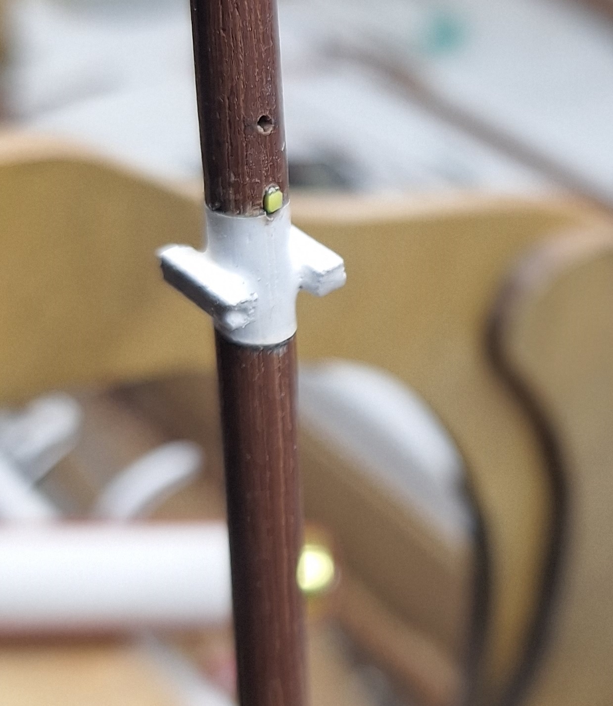 Да, наверное Вы правы, так будет прочнее, но пока, ПВА нормально держит хотя, прочность клеевого соединения и ниже прочности этой древисины. Но там много перпендикулярных отверстий, я их просверлил до прокладки проводов. Некоторые элементы такелажа проходят сквозь мачту. Не знаю, на сколько это соответствуе действительности, но именно эту часть я менять (отходить от инструкции) не буду: в этом проекте настолько много допущений, что изменение такелажа (по крайней мере именно этой части) на проект никак не повлияет.