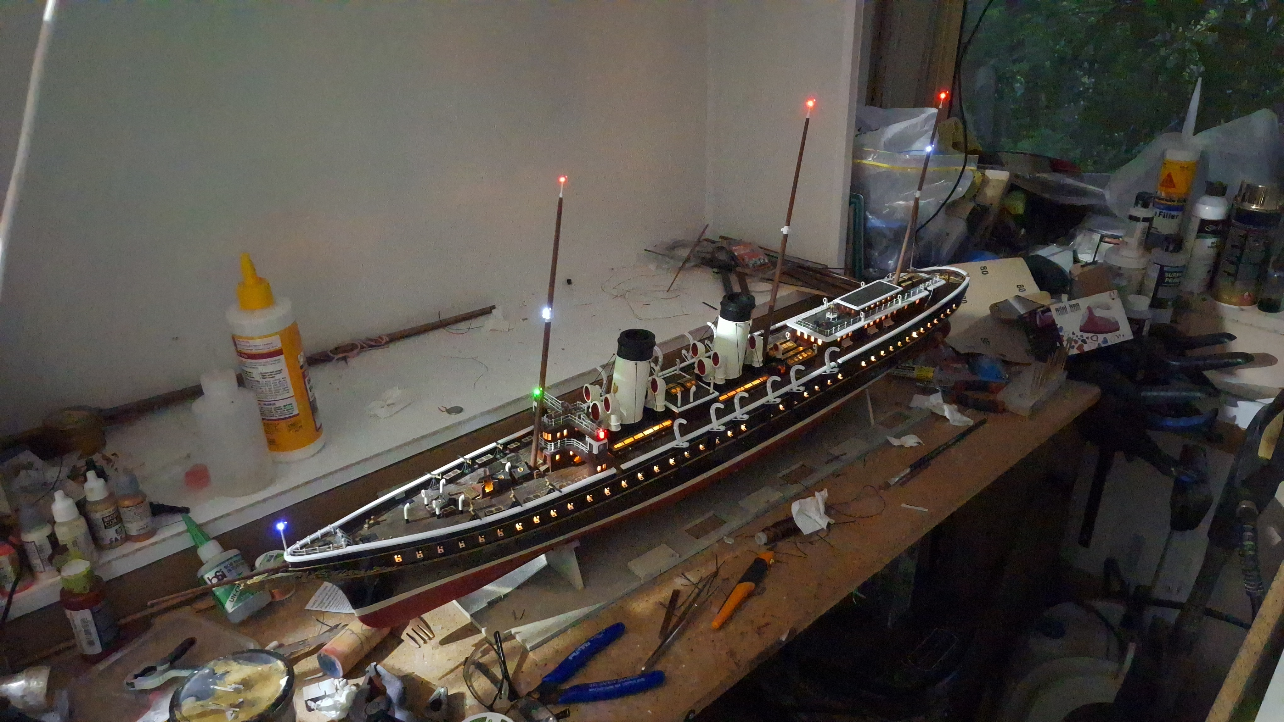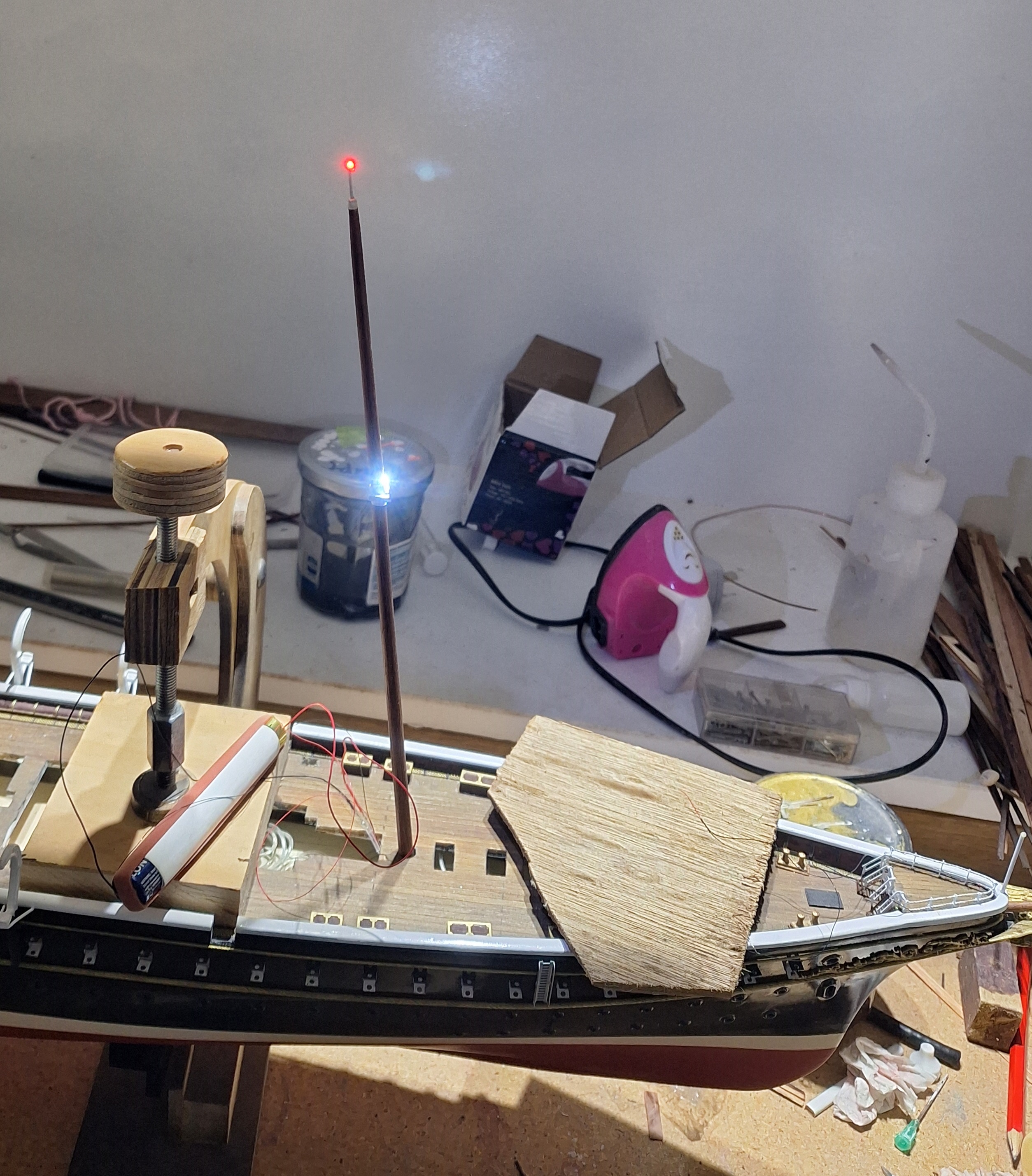 Случилась у меня печаль, пока ковырялся с проводами, умерли два клотиковых светодиода. Пришлось мачты выклеивать, хорошо, они на цианакрилате сидели и антиклей умудрился его растворить не повредив вё вокруг.