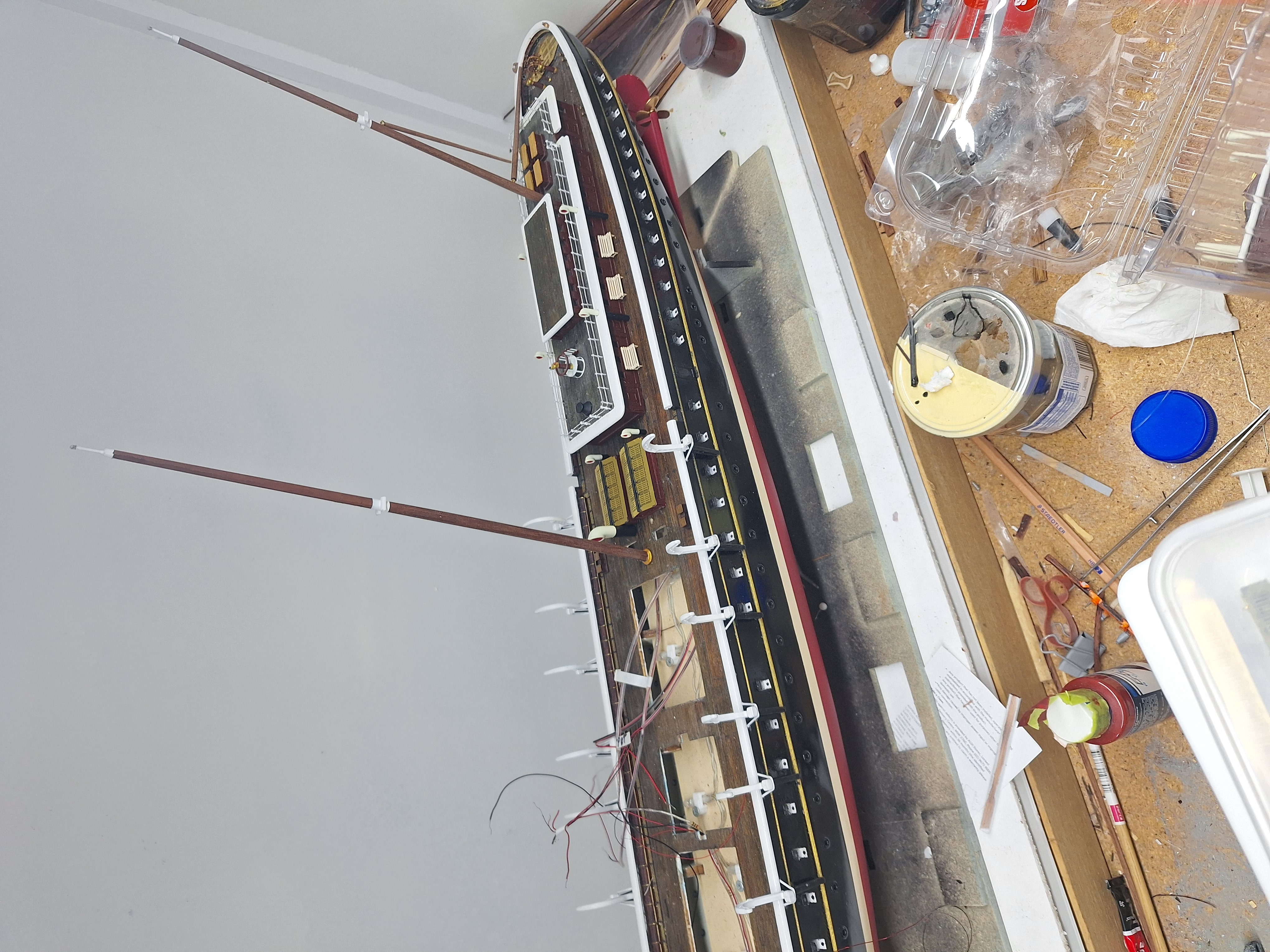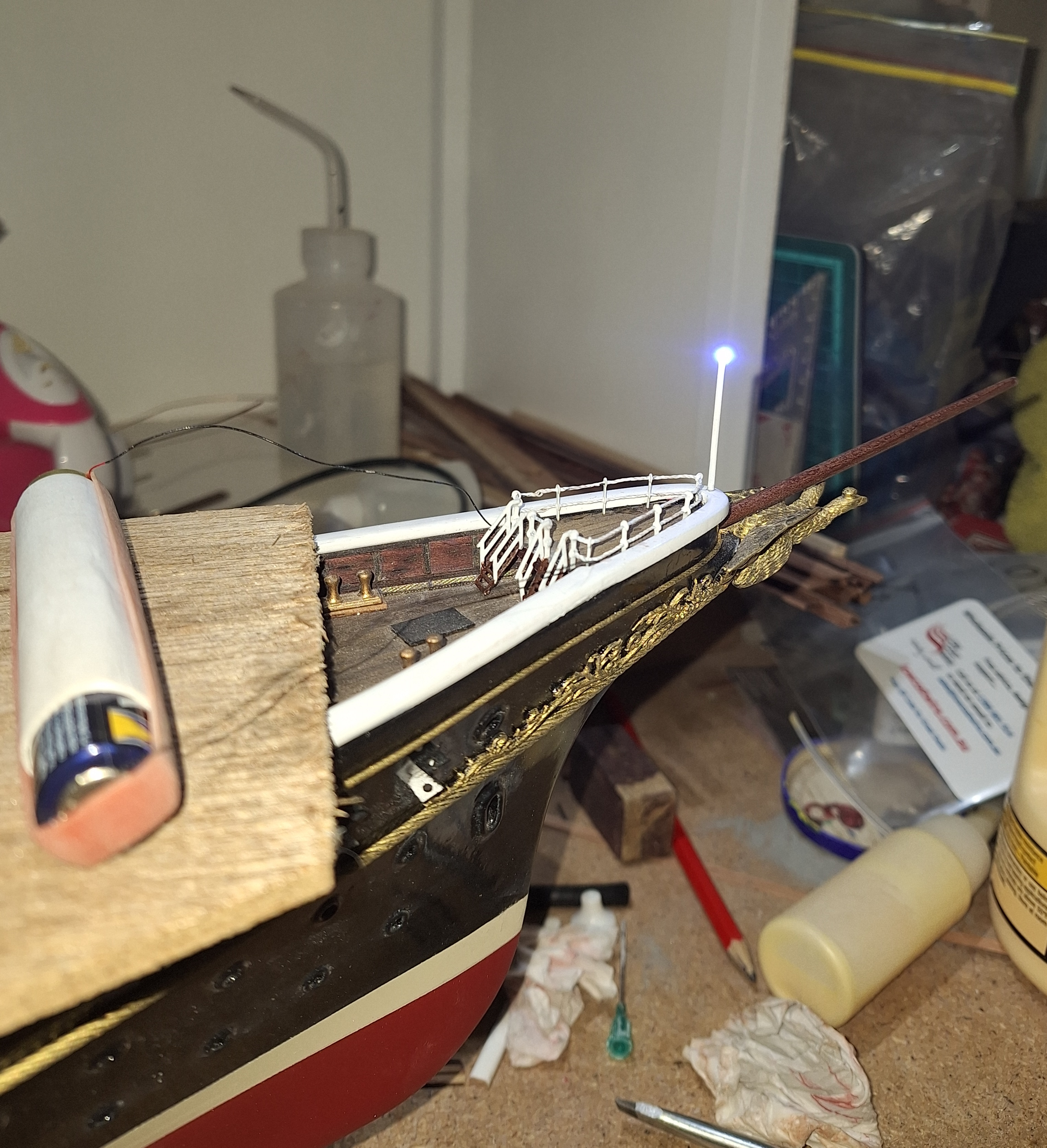 Так как баковый и кормовой огни придумал ставить после того, как установил планширь, пришлось провода прятать под него и сверлить палубу (Баковый ещё не доделан)