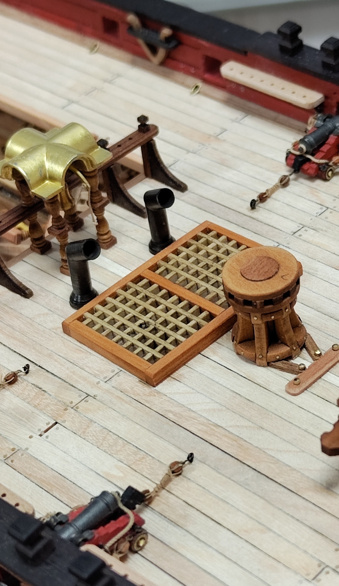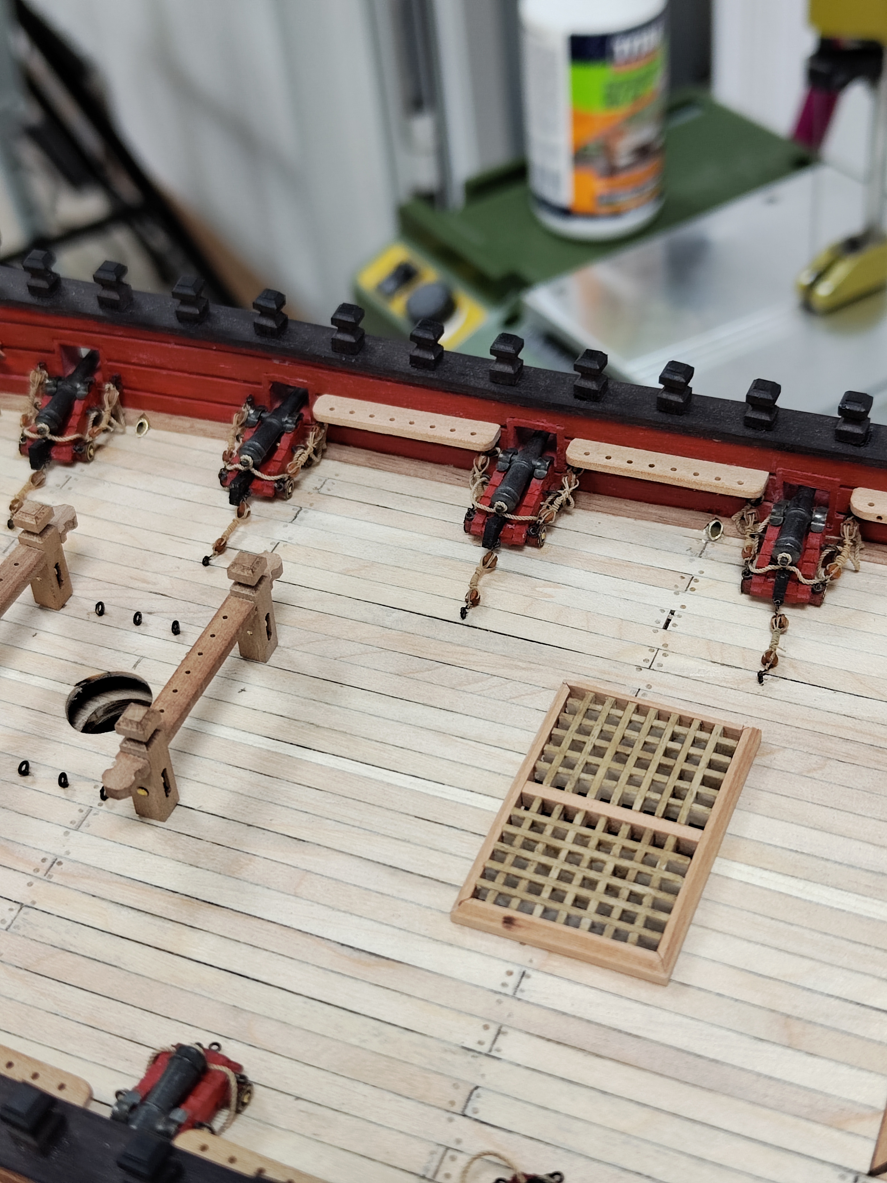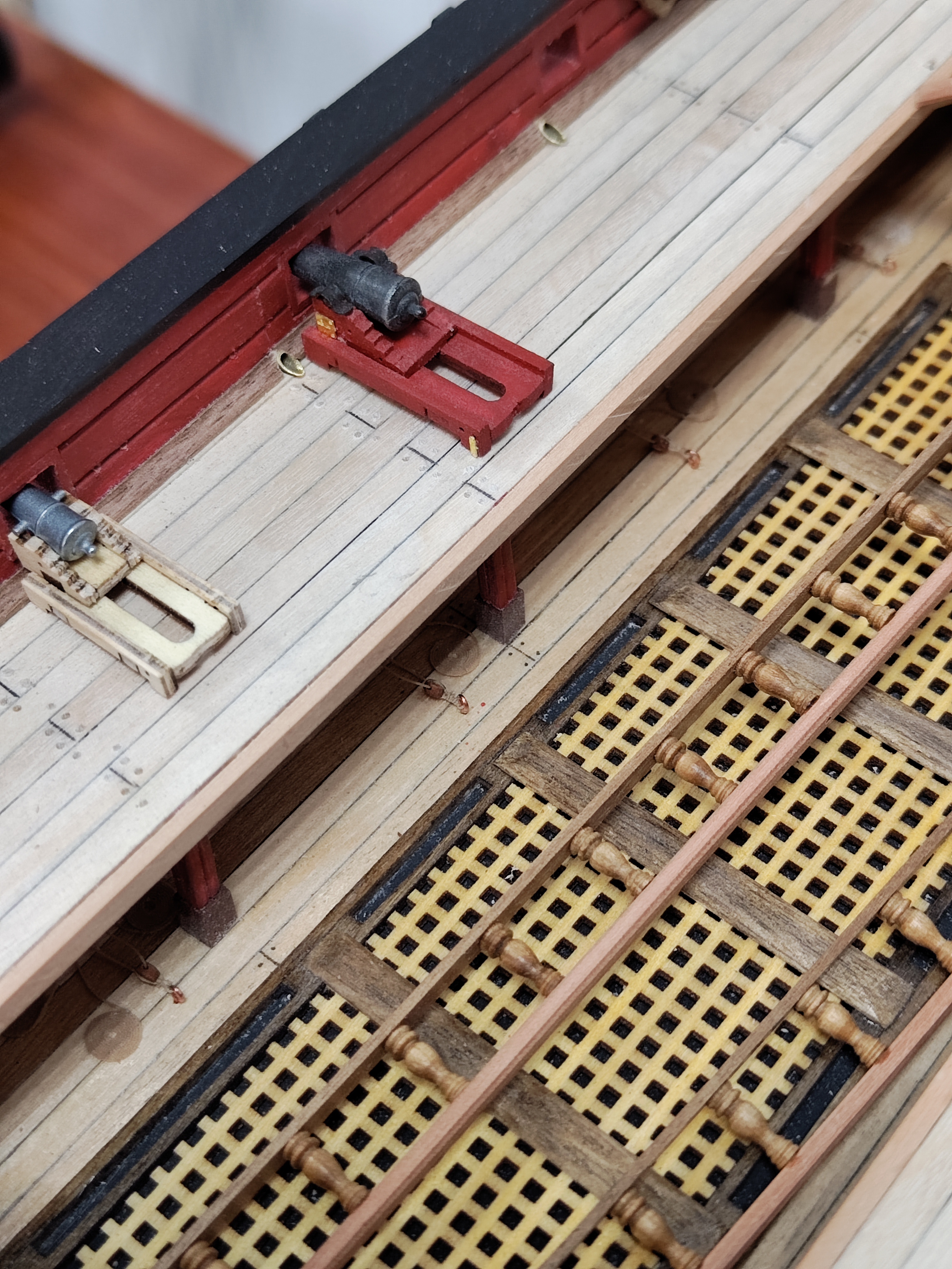 3. При работе над рустерными решетками верхней палубы модели, не плохо бы сразу же подумать о размещении пушечных ядер в "кранцах первых выстрелов",размещая ядра в нишах рам этих решеток...
