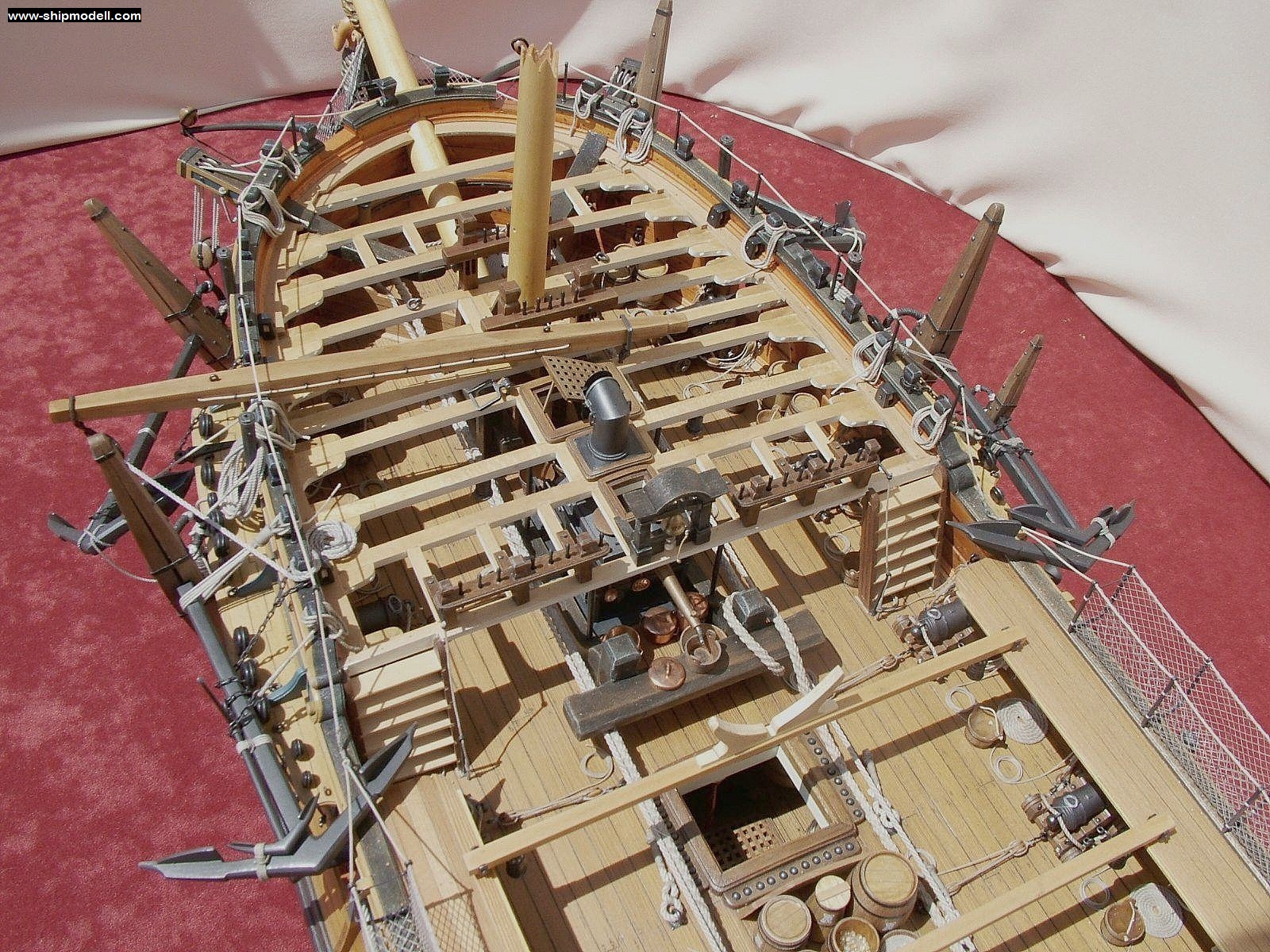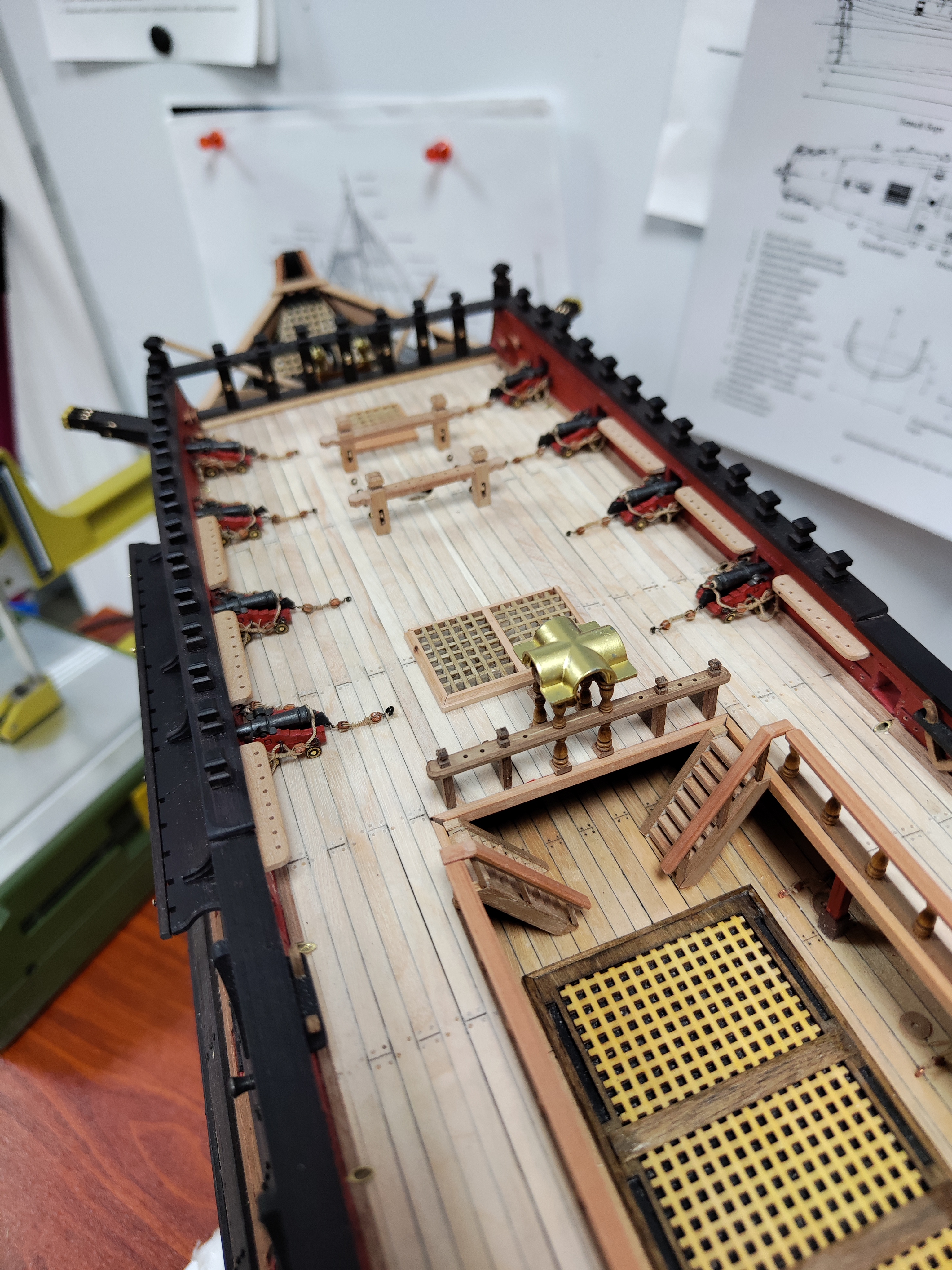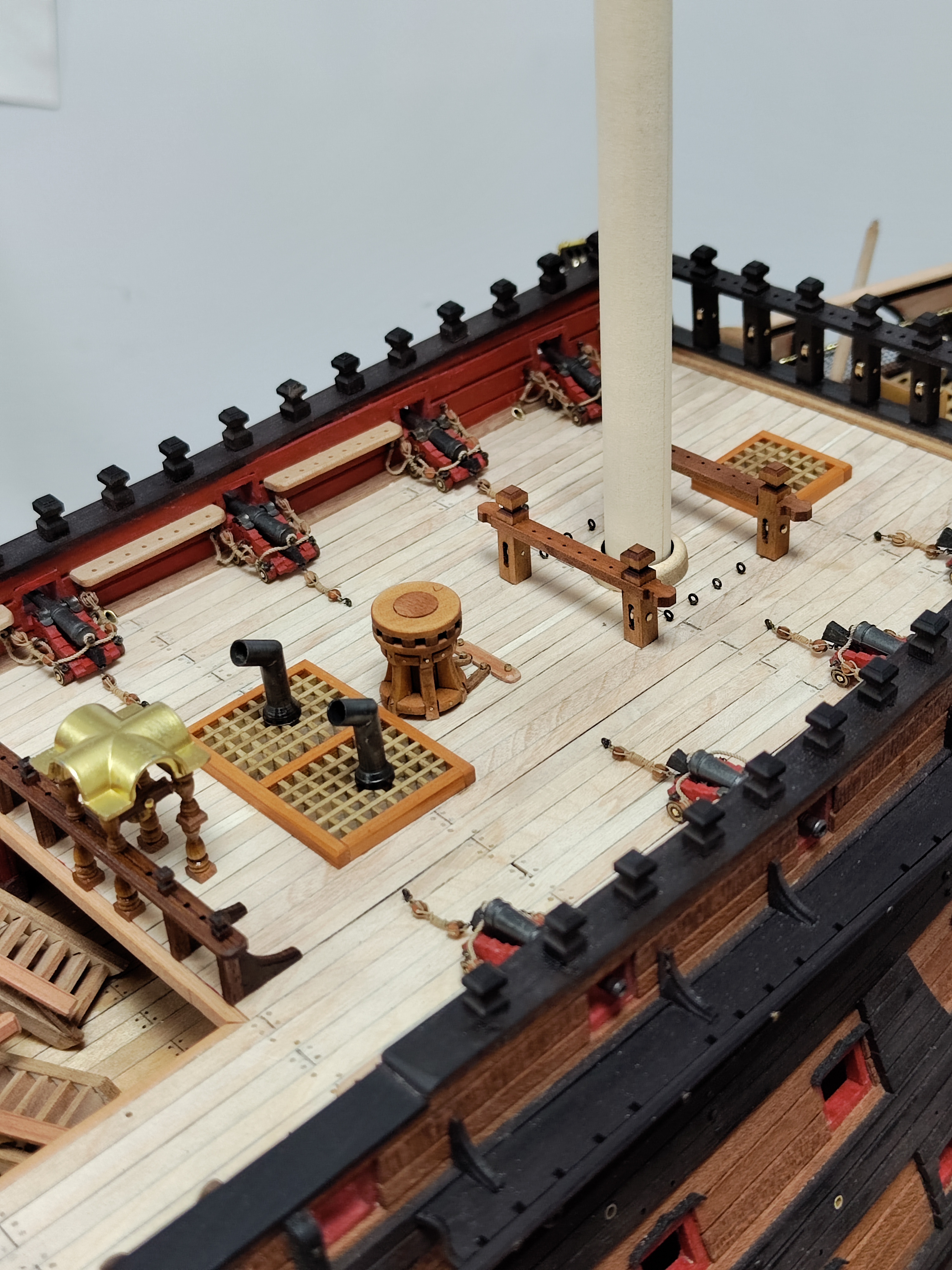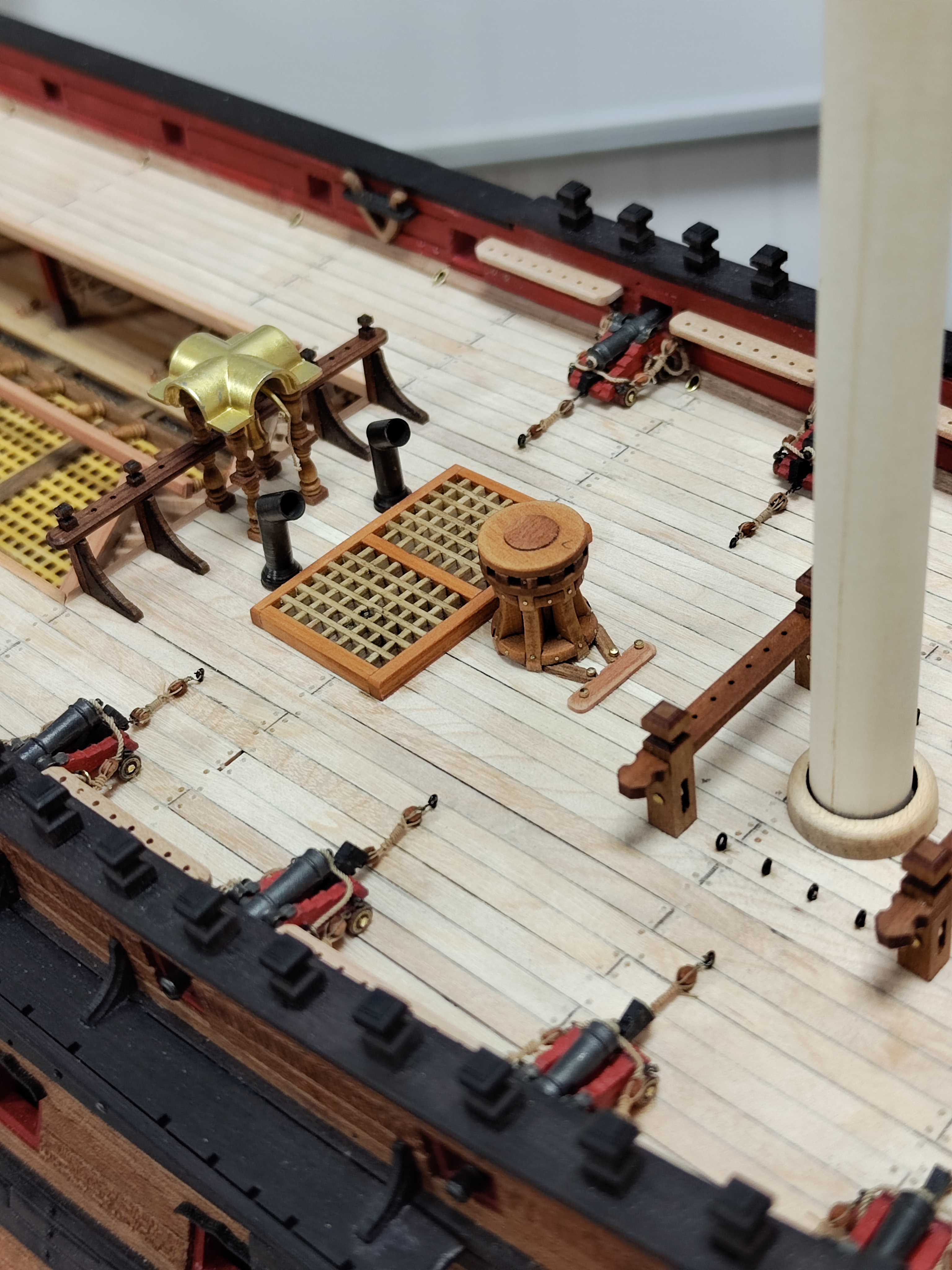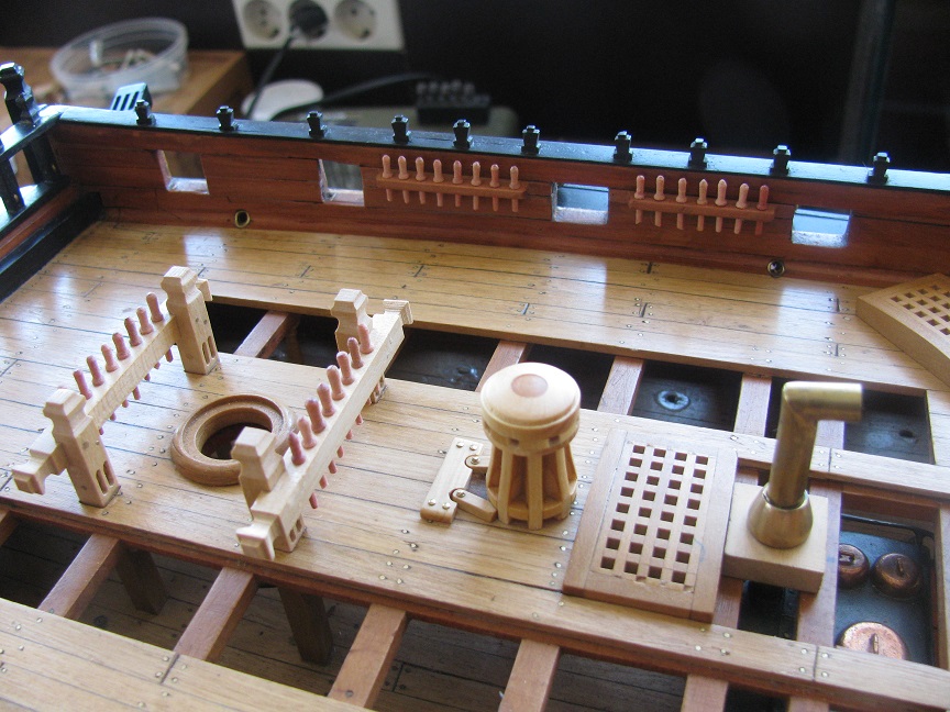 1.Я бы не советовал делать кофель-нагельные планки слишком широкими. Они в месте с бухтами (куклы) тросов в общем итоге займут очень много свободного об"ёма площади верхней палубы корабля.