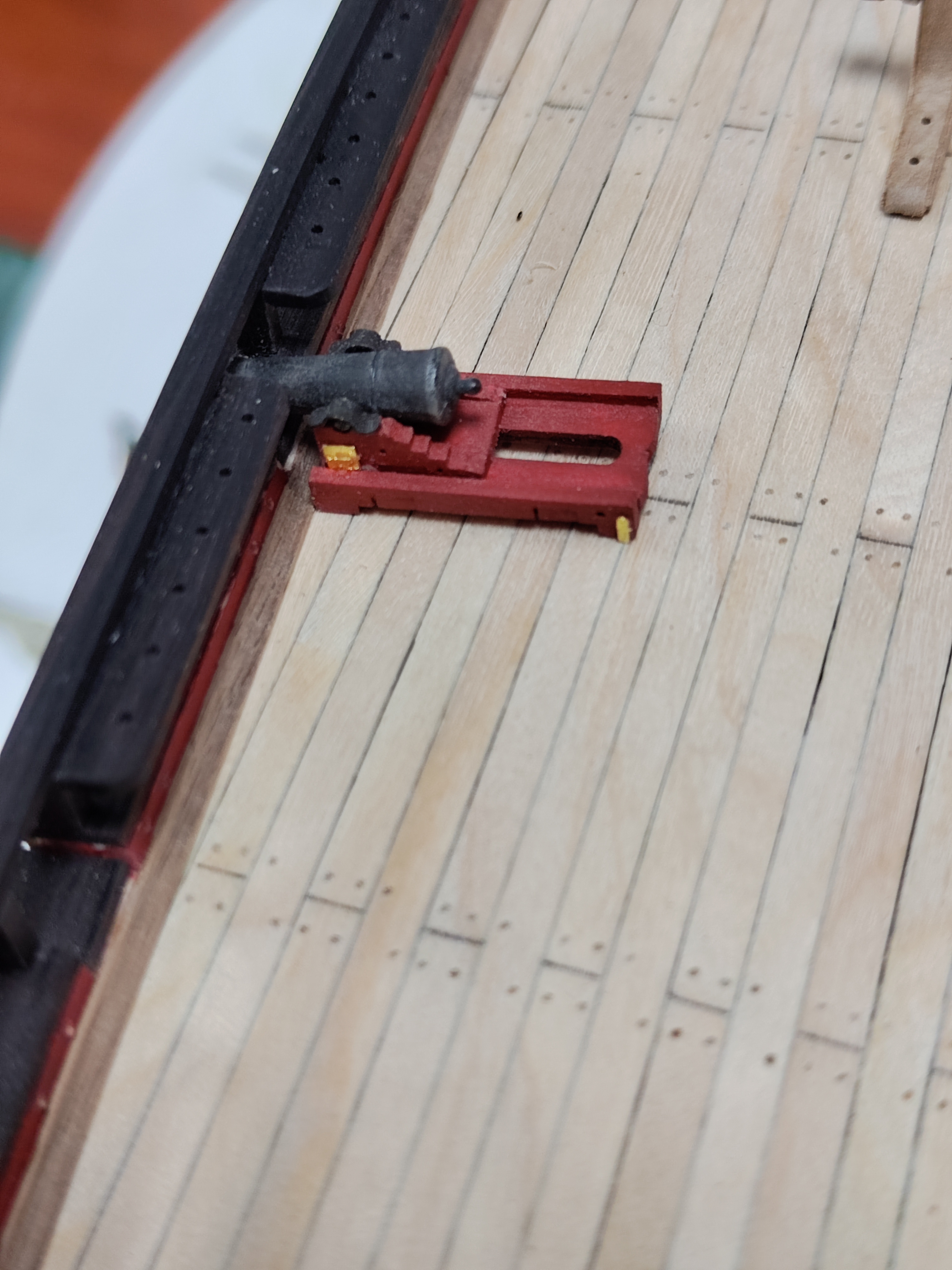 Всем добрый день! Настал этап сборки и установки пушек типа "Е" и типа "G" на шкафут и ют. Но у меня нормально что-то не получается. Согласно описанием на этот тип орудий: 1) Выдвижение орудия относительно наружной кромки борта минимально допустимое 16,5 дюйма (16,5*2,54)/84=0,5 мм; 2) Верхняя поверхность платформы должна находится на уровне нижнего косяка порта. Этим двум условиям подходит если пушку типа "Е" поставить на ют вместо пушки "G".
