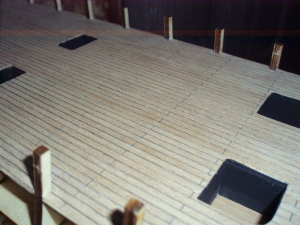 понравилось только одно — имитация торцов досок чистового настила палубы. Её (палубу) я выполнил так: после приклеивания всех досок палубы сначала процарапал большой и толстой швейной иглой (в далёком детстве такую иглу называли "цыганской") для ручных работ, а потом твёрдым карандашом 2Н...3Н елозил бороздки, вдоль досок и поперёк. Вид бороздок поперёк меня удовлетворил — всё ровнехонько и красиво. Точно такой же процесс вдоль "досок" не давал желаемого результата — чётких границ досок настила не было. Линии были расплывчатые и неровные.