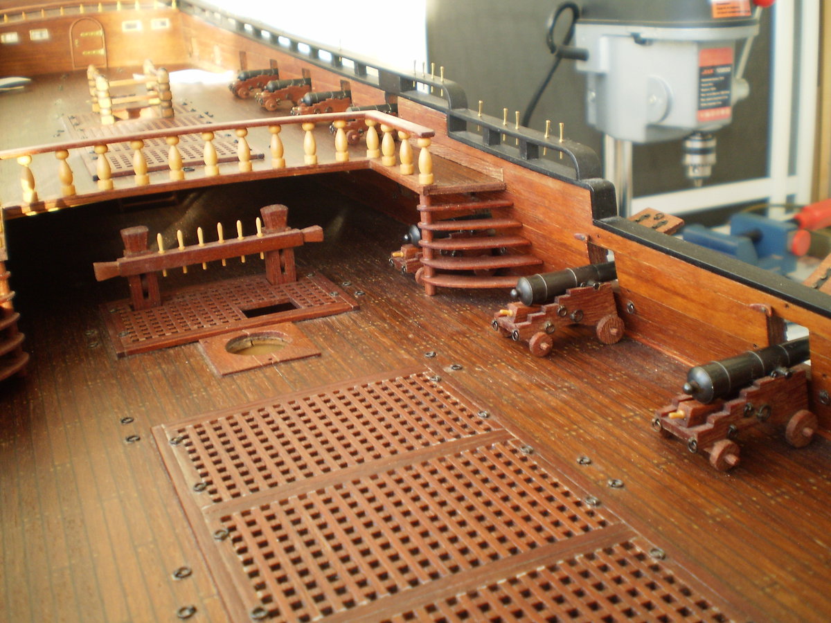 Лафеты пушек палубы квартердека окрашивал кисточкой краской VALLEJO, серия HOJALATA TINNE TIN, цвет тёмно-коричневый металлик №72.060. Стволы всех пушек, после зачистки надфилем от заусенцев и полировки торцовой металлической щёткой, обезжиривал антисептическим средством на основе этилового спирта, не грунтовал и красил кисточкой краской KREUL, серия ACRYL MATTEARBE, цвет чёрный.