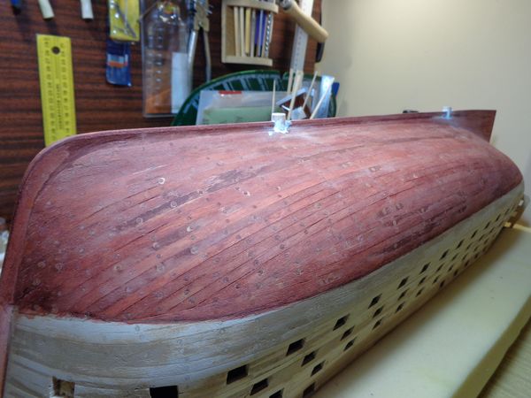После исправления положения пушечных портов квартер-дека несколько раз наложил минимальные слои шпатлёвки в местах исправления с последующей шлифовкой наружных поверхностей корпуса модели.