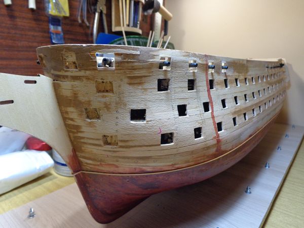 После исправления положения пушечных портов квартер-дека несколько раз наложил минимальные слои шпатлёвки в местах исправления с последующей шлифовкой наружных поверхностей корпуса модели.