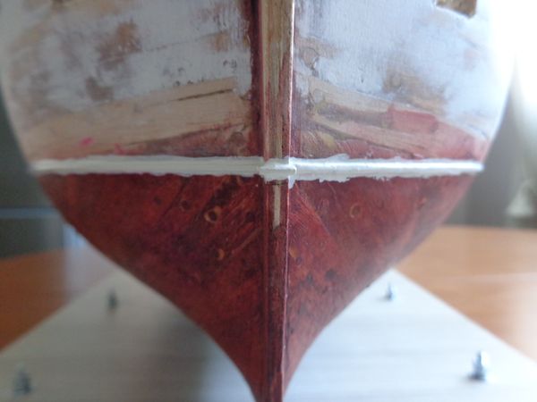 Из купленных весной реек 1х1 мм наклеил полоску по ватерлинии модели. Клеил с использованием термоаппликатора и полоска у меня получилась на ровная, а волнистая, особенно при взгляде с носа или кормы. Используя этот термоаппликатор я снял полоску, зачистил места приклеивания, снова нарисовал ватерлинии и снова приклеил полоску. Но уже без использования технических средств, а используя только пальцы рук. И уже этот вариант полоски меня устроил.