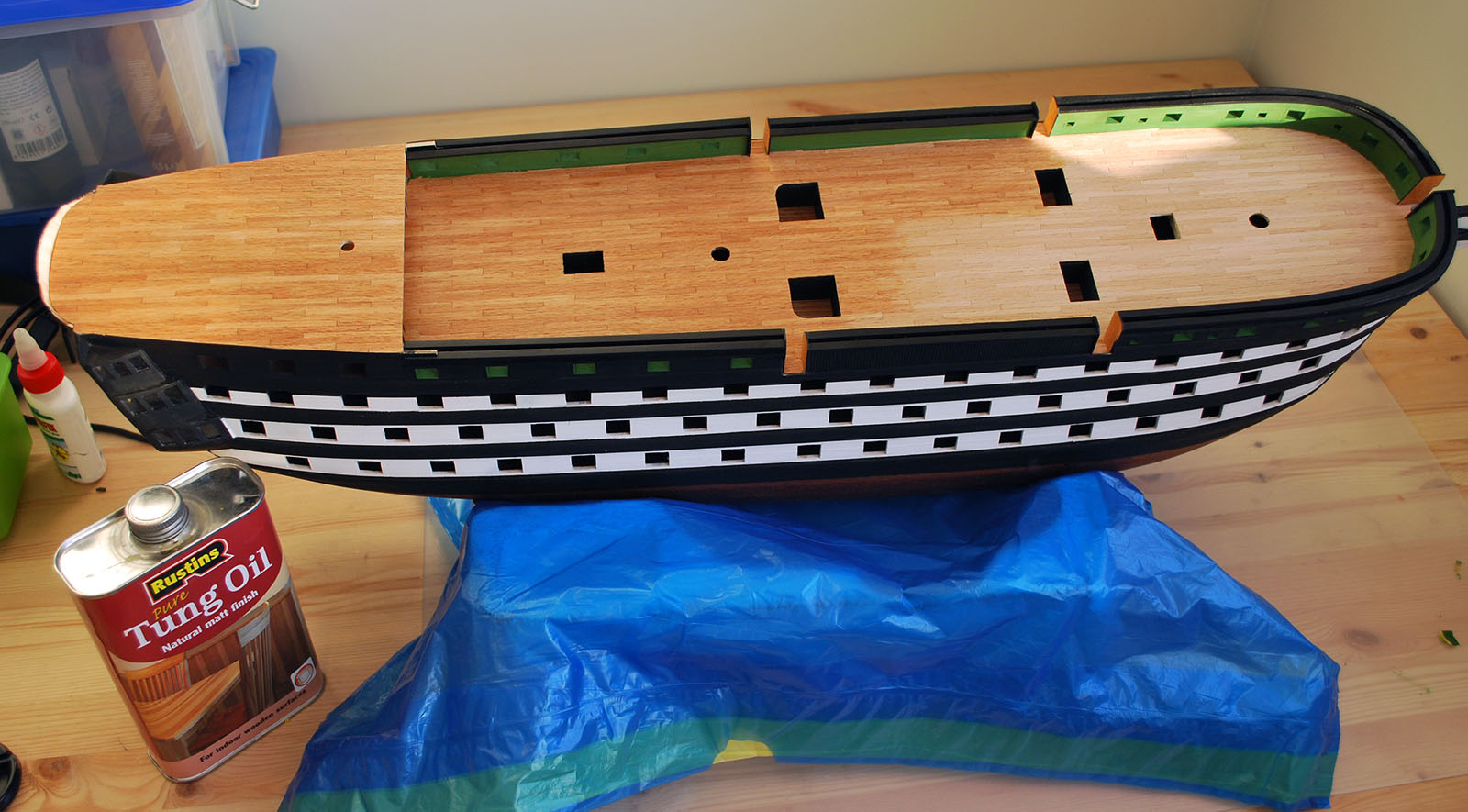 На фото только покрытая маслом палуба выглядит сильно разнородной, но при высыхании этот эффект немного сгладится, а при размещении всего палубного хозяйства и вовсе стане незаметен. А вот получившийся золотистый цвет понравился, довольно похоже на палубу моделей ЦВММ.
