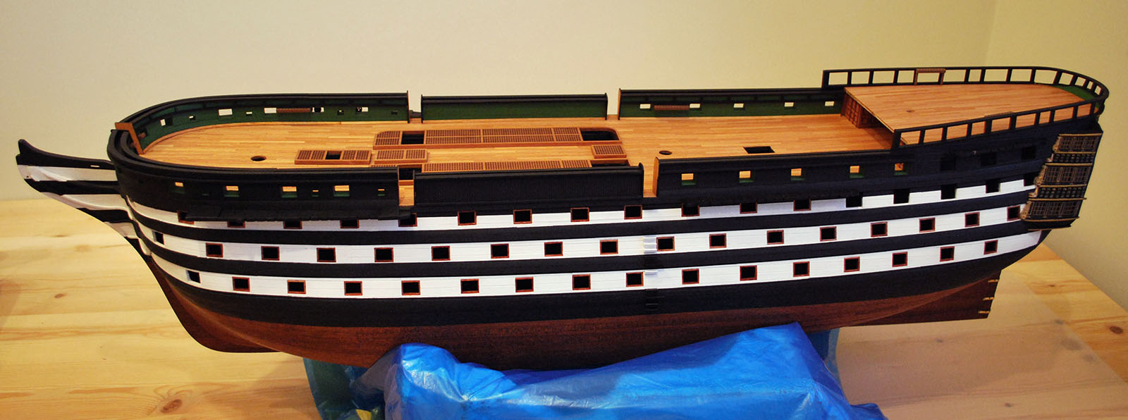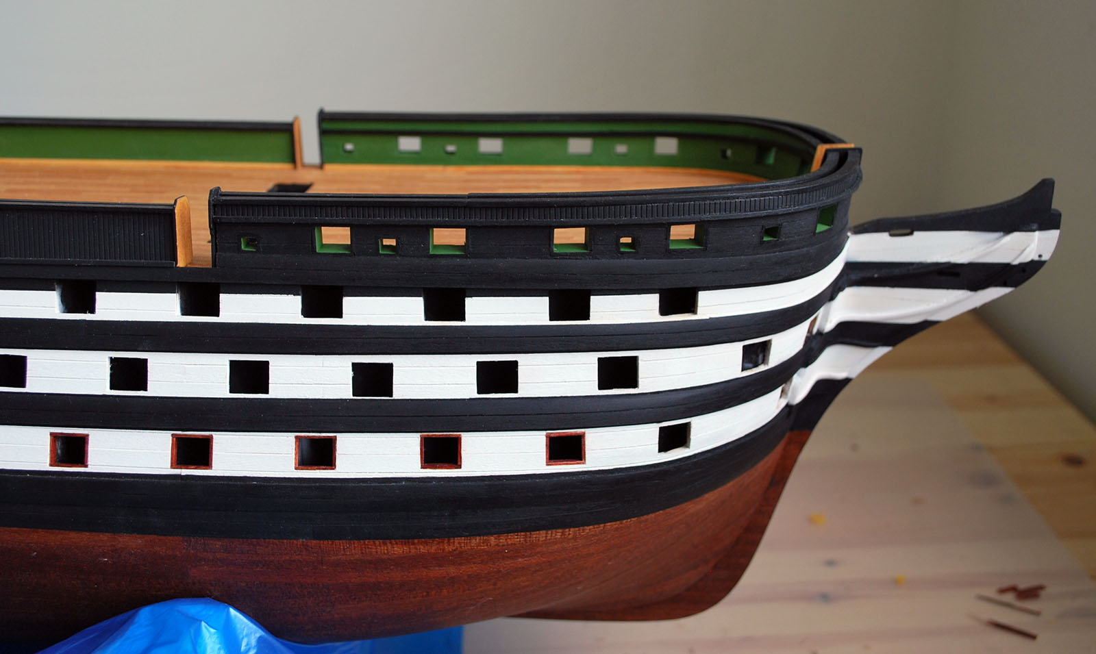4) укоротить ют с переносом трапов. Закрывать и сдвигать порты, когда уже все прорезано - не дело, да и на вид сбоку корабля будет уже не похоже. Укоротить палубу - тоже оказалось совсем не просто, там переделывать и ограждение юта и положение бизань-мачты сместится. Такие решения надо принимать на уровне сборки силового каркаса. А это первый корабль, опыта нет, собрать аккуратно по инструкции - уже достижение. Да и сам формат патворка, когда видишь только этап постройки без представления конечного результата, свое дело сделал.