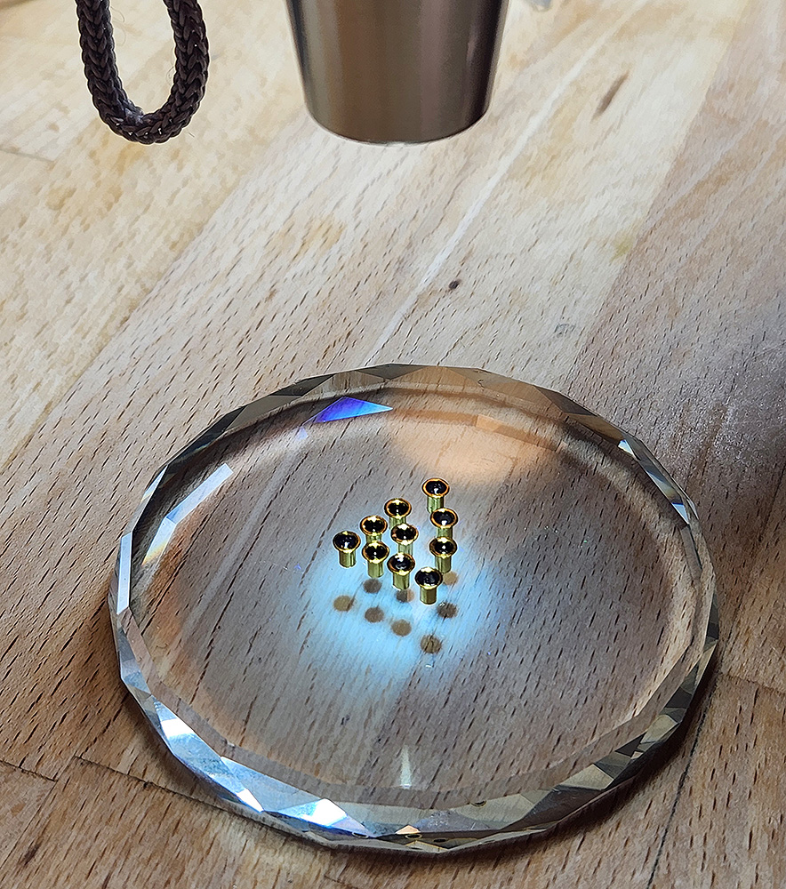 Вспомнил, что хотел сделать иллюминаторы. В патворке они не предусмотрены, а на чертеже, если постараться их можно найти. В нашем масштабе иллюминаторы около 2 мм. Прикупил заклепки из латуни, самые маленькие которые нашел - внутренний диаметр 2 мм, внешний 3 мм, по 10 рублей штука. Для имитации стекла пришли на помощь ногтевые технологии - надо нанести тонкой кистью лак, полимеризующийся под УФ-лампой.