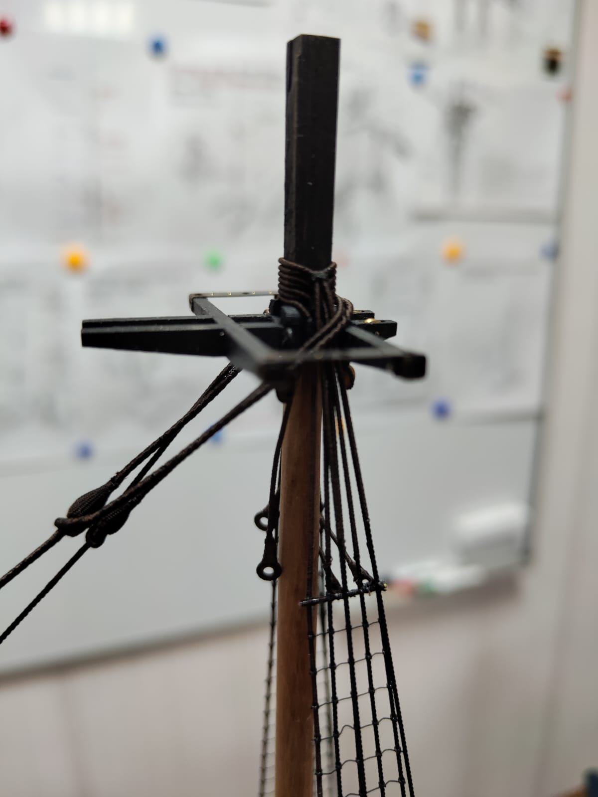 Не подскажите такой момент - у Вас рей действительно висит на борге или жестко прикреплен штифтом к мачте? Читал где-то про жесткое крепление к мачте для нижних реев и сам так сделал на предыдущей модели. Если висит, как рей притянут к мачте? Бейфут вроде видно, а куда он тянется вниз сложно разглядеть. По Петерсону идёте?