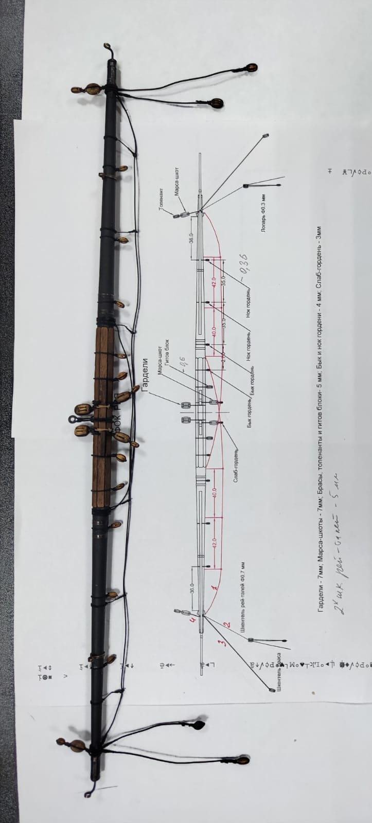 Закончил отакелаживание рей бизань мачты. Теперь примемся за паруса.