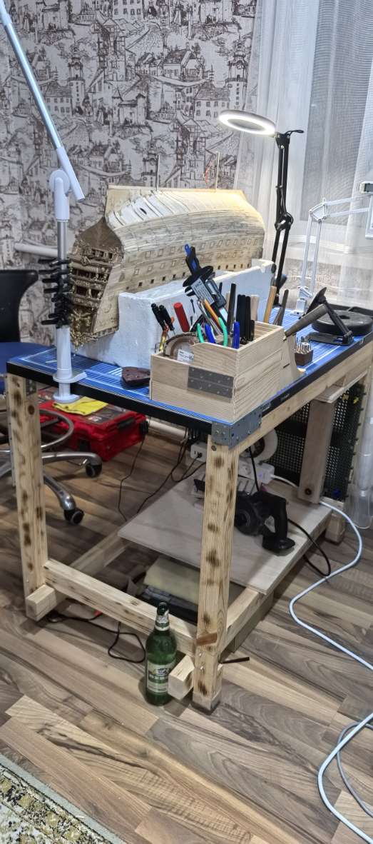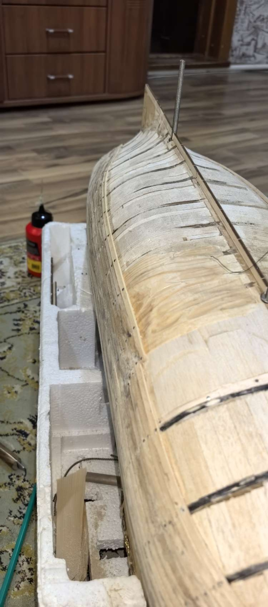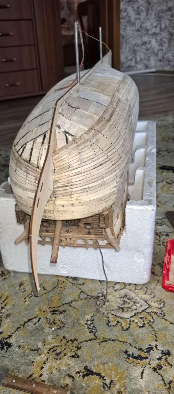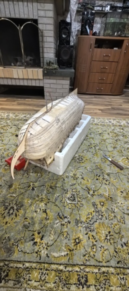 Завершил черновою обшивку корпуса корабля Soley Royal, а это значит, что внешняя оболочка корпуса, сформирована из первичных планок. Это основной этап строительства, после которого начинается обработка корпуса (шлифовка, шпаклевка) и переход к чистовой обшивке и другим работам.