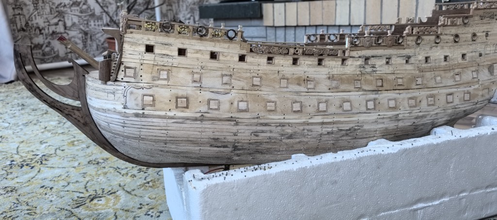 Продолжаю заниматься корпусом корабля, перебрался на борта. Шлифую, наношу шпатлёвку. Опять шлифую.