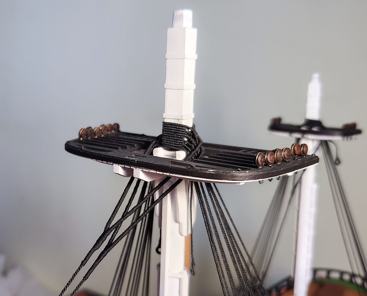 Такелаж у марса сложное, но и красивое место. Хотелось сделать хотя бы близко к правильному варианту. Характерно для того периода времени - верхний ворст отсутствует, путенс-ванты идут прямо к мачте. Нижние ванты закончены.