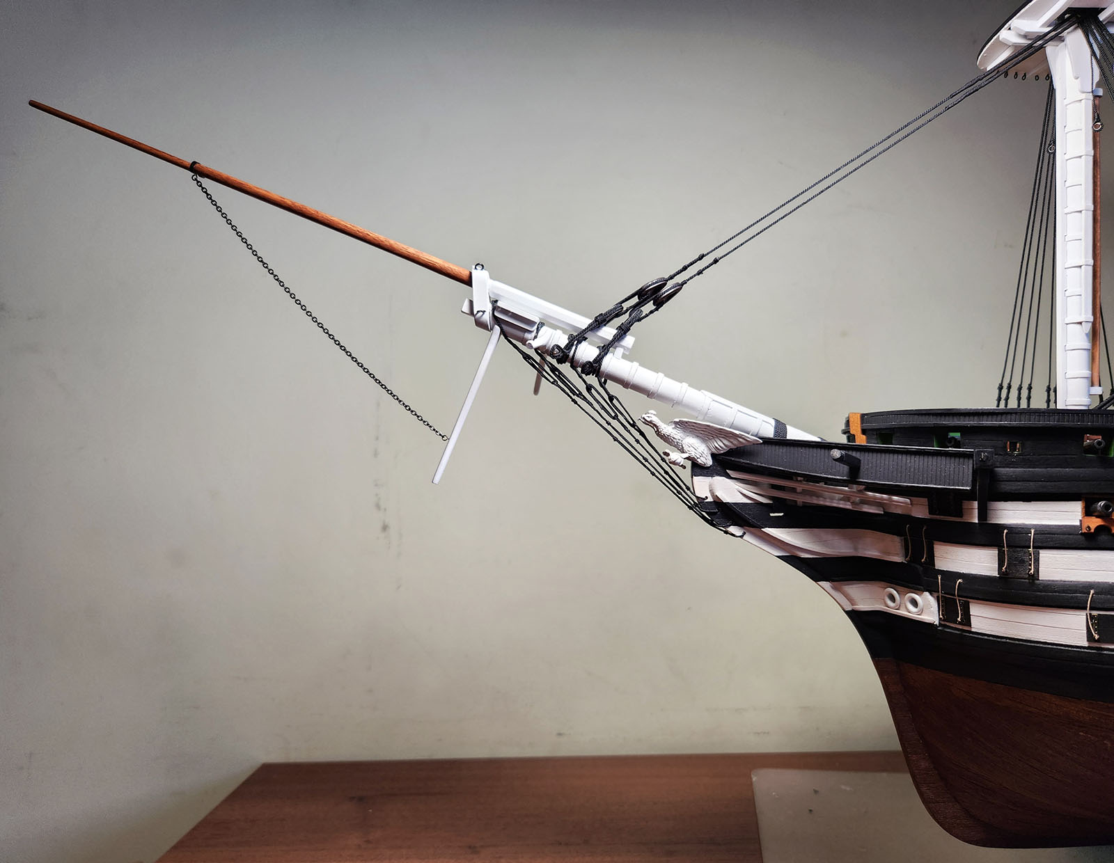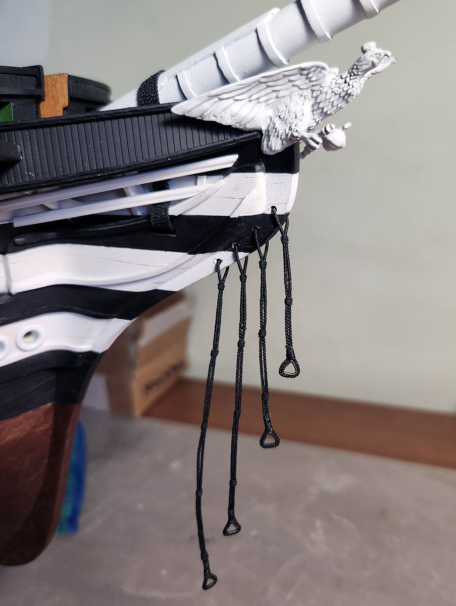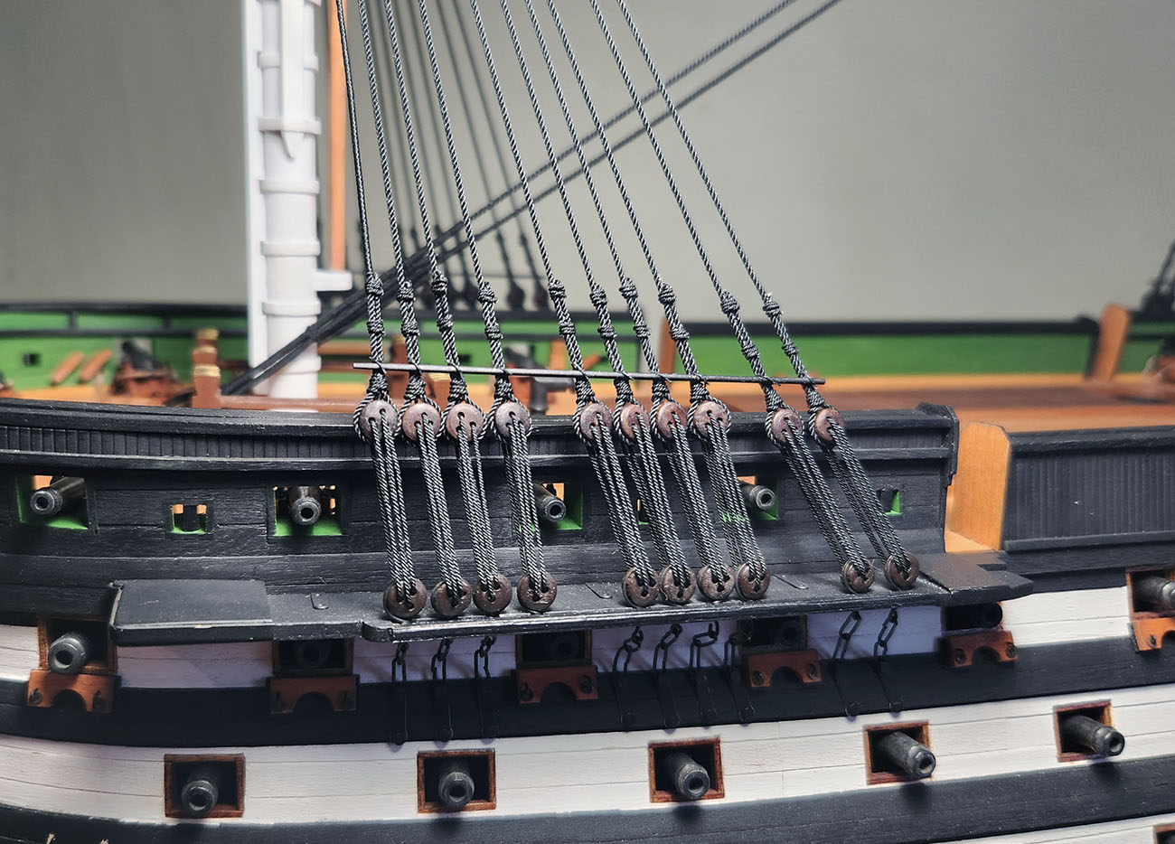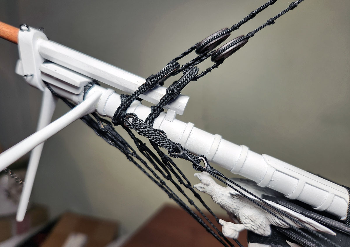 Установил нижние ворсты на ванты. Исторически это был металлический прут, но проволоки подходящего диаметра я не нашел и сделал из рейки груши, покрасил.