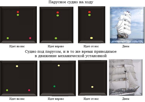 В принципе, международные правила только формировались, но на современных кораблях ставится либо белый топовый либо два - красный над зелёным на передней мачте (в зависимости от того, идёт корабль только под парусом или под парусом и мотором.)
