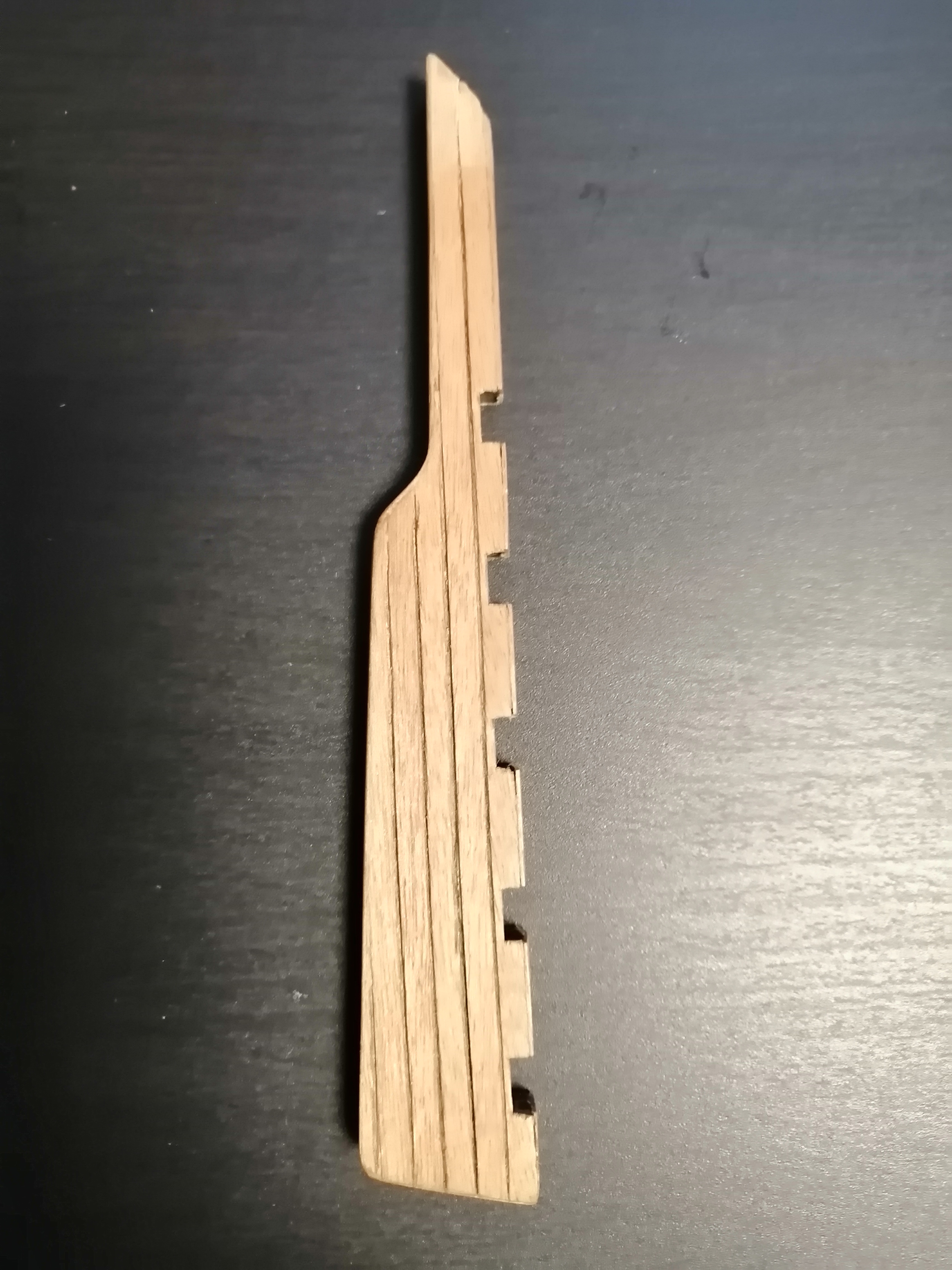 Продолжаю работу по подвеске пера руля на модели парусного линейного корабля. Руль у модели парусника одно из слабых звеньев в конструкции корпуса модели. Обычно при переноске модели из комнаты в комнату с одной полки на другою мы обычно беремся за днище модели и за перо руля. Неловкое движение, сухой щелчок и перо руля отламывается. Я планировал при работе с корпусам закрепить перо руля за фальшкиль. В принципе и у настоящих судов часто судостроители крепят руль через шарнирное соединение. Крепя руль за шпору в фальшкиле судна. Эта шпора часто защищает конструкцию руля от поломки. Но моя шпора оказалась слишком малой. Значит нужно часть фальшкиля в кормовой части стамеской срезать и наклеить новый отрезок фальшкиля. Если решено - значит сделано! Остаётся только закрепить всю конструкцию нового фальшкиля на клей и на 1,5 мм нагеля - бамбуковые зубочистки.