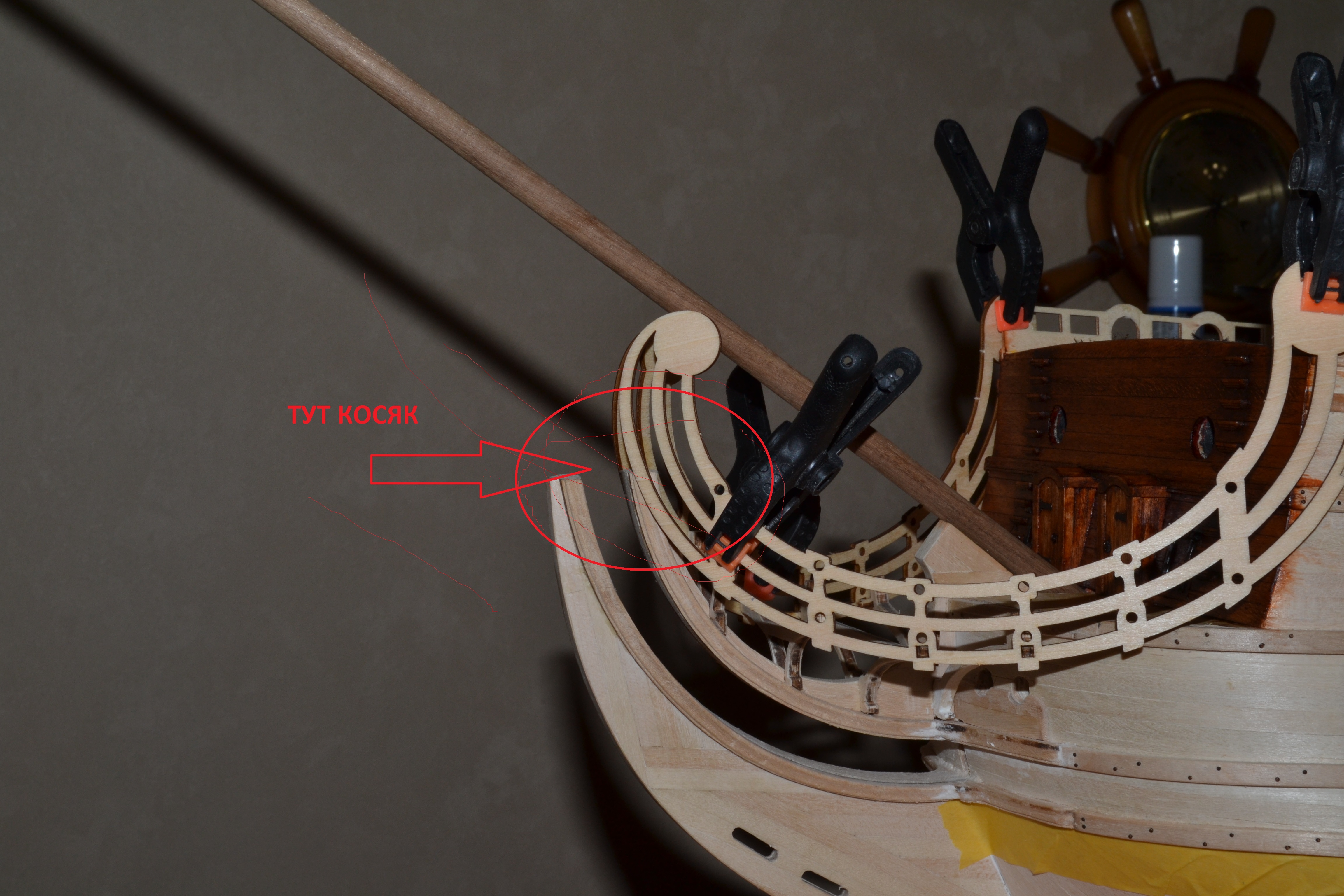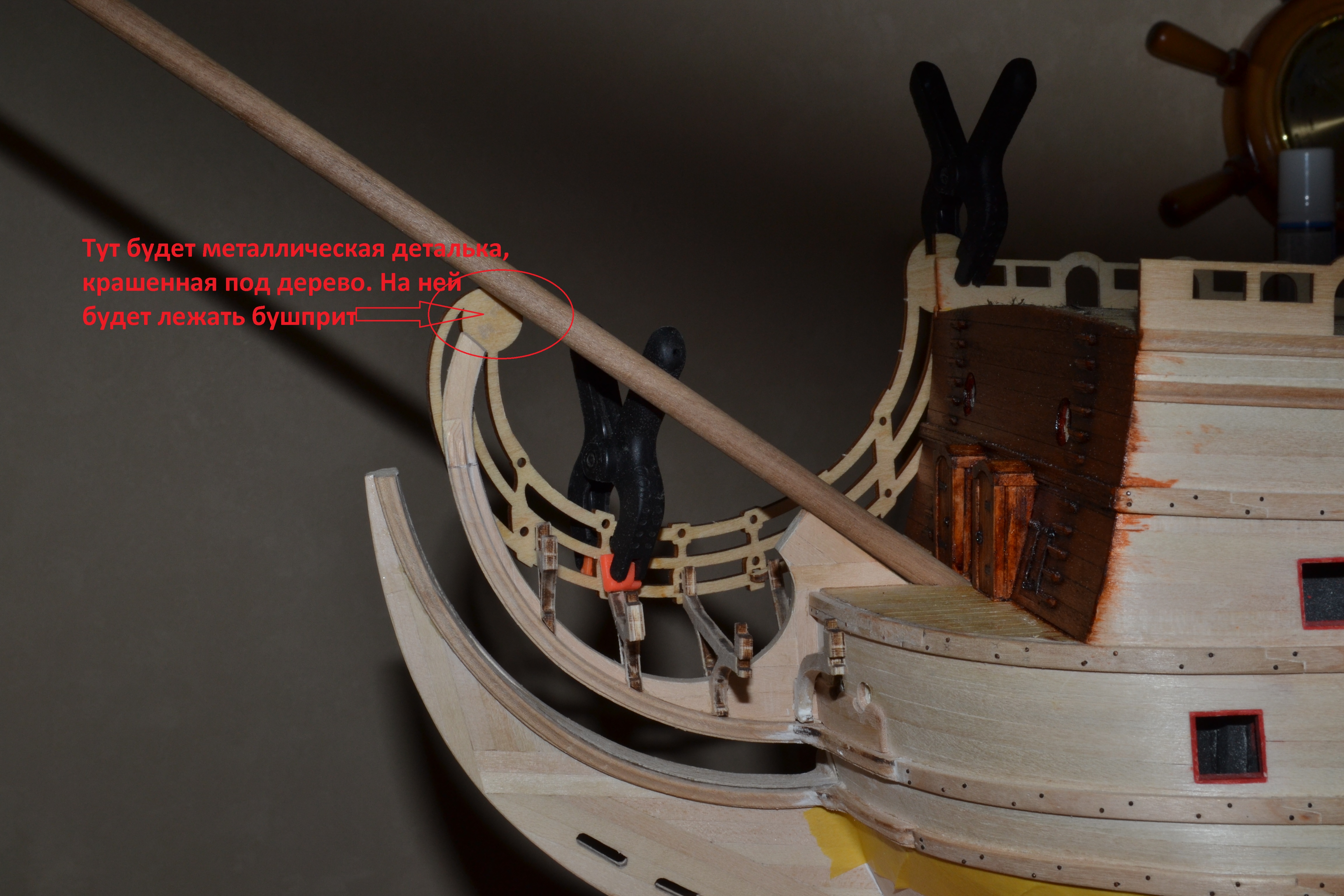 Дело медленно, но уверенно движется к покраске. Но сначала надо решить с опорой бушприта. ДеА накосячили - сделали опору короче, чем надо. Я это уже упоминал. Вот фото с косяком