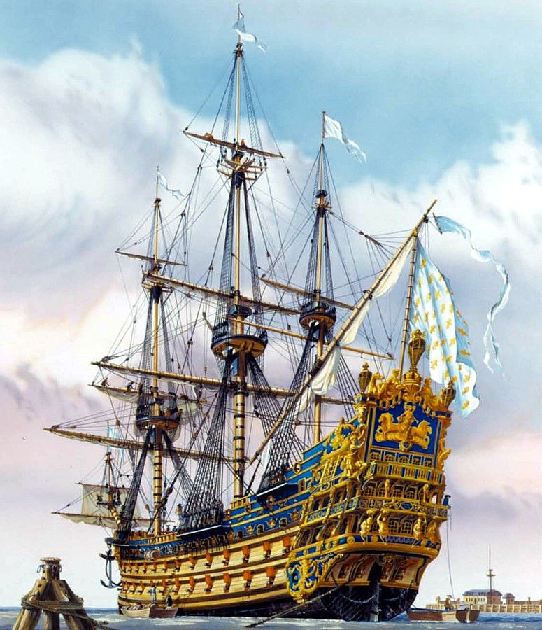 Итак, покраска... Я пересмотрел в интернет огромное количество фоток моделей Soleil Royal. Есть деревянные, пластиковые, даже по-моему один бумажный видел. Видел пару картин.Вариантов окраса модели довольно много. Общее у почти всех - это синий (или голубой) верх, белый низ, над белым немного черного. А вот среднюю часть бортов красят кто как хочет. Где-то в каком-то магазине видел даже набор красок от Верфи на столе для Soleil Royal.