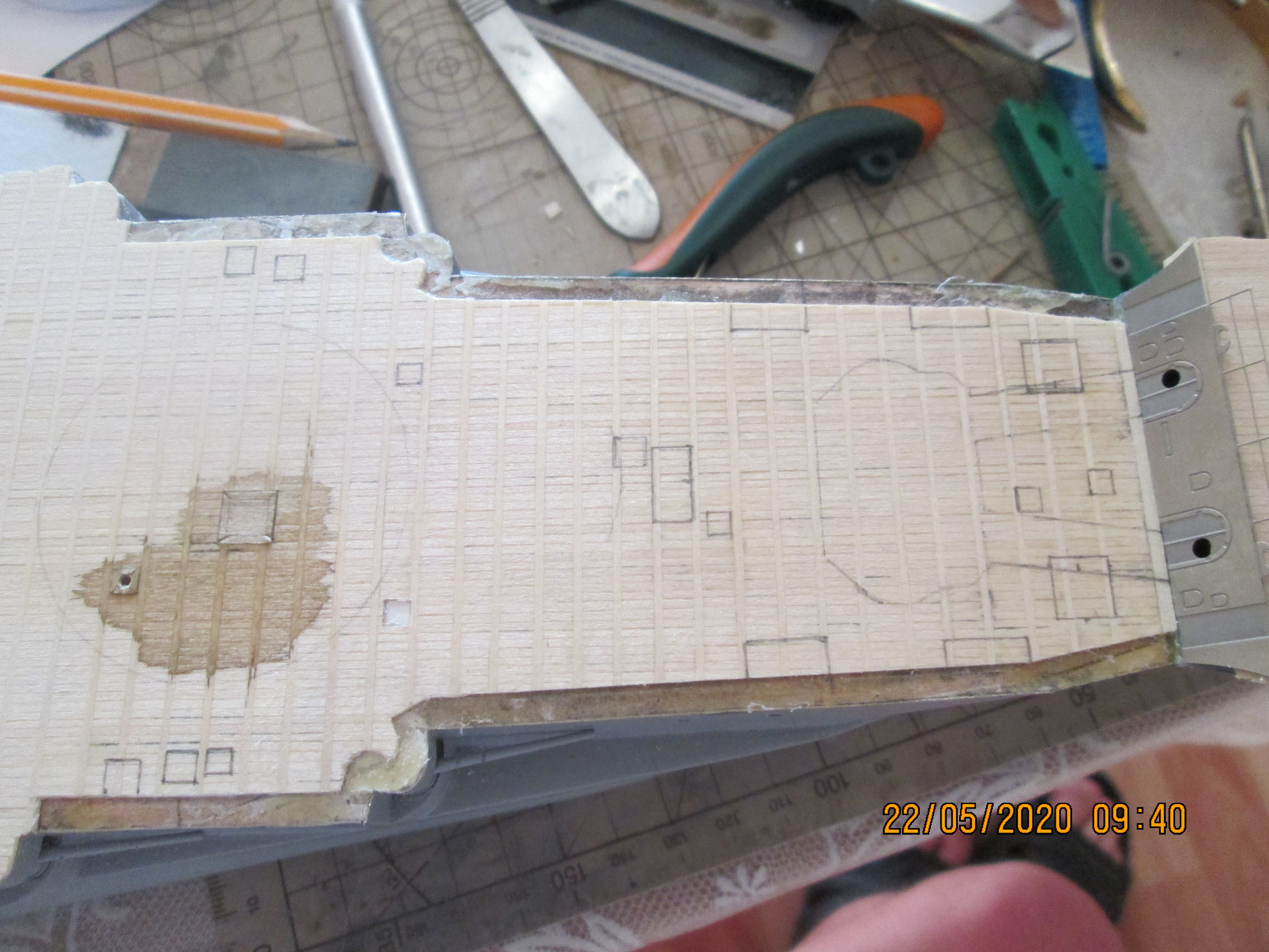 Далее. Размечаем расположение элементов. Прорезаем и выковыриваем. Вклеиваем подготовленные площадки.После высыхания клея прорезаем на площадках имитацию досок. Останется только просверлить отверстия.