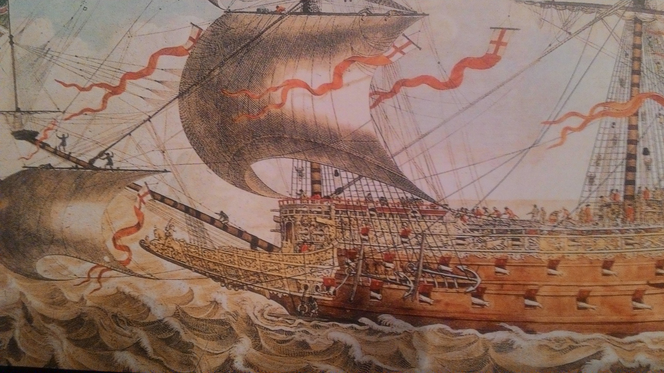 На гравюре Пэйна раздвоенные вымпелы или как их ещё называют вымпел с косицами, только на ноках нижних реев и на флагштоках, эти вроде брейд-вымпел называется, остальные простые. Как на той гравюре, что Вы показали)