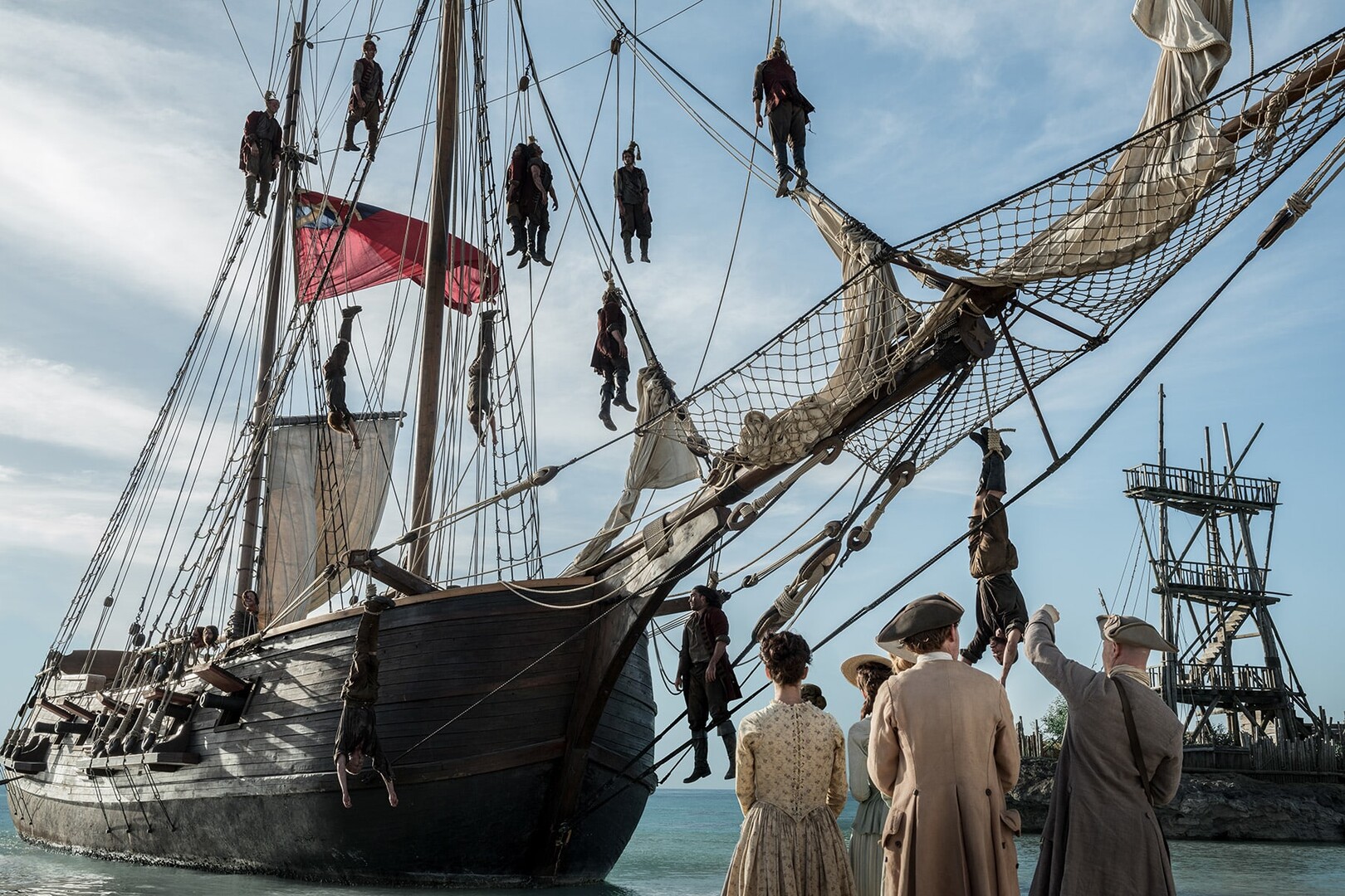 О бумажных флагах для своей модели я отметаю сразу. Строить свою модель волею судьбы пять лет и навесить на неё бумажные картинки, в место королевских штандартов я просто считаю - кощунством. Бумага - материал слабый и в соединении с комнатной пылью быстро обветшает и потеряет свой реализм. С задачей сохранить форму развевающегося флага, я в какой то мере надеюсь справился. Как пример посылаю вам фото своего флага, где модель с этим флагом живет уже около пяти лет. За это время мой Флаг на модели не потерял форму. Технология изготовления довольно простая: Пропитка ткани (флагдуха) клеем ПВА. Клей развел мертвой водой (кипяченая - лишенная споров, микробов и плесени) до концентрации жидкой сметаны. Пропитанный клеем флаг уложил на специальный кондуктор в виде куска фанеры с наклеенными поперек мелкими рейками в виде тельняшки. Дал просохнуть в таком виде ну не мении суток, а затем еще раз пропитал флаг тем же клеем и высушил его на кондукторе. Но это флаг, где соотношение сторон длины и ширины не слишком велики и совсем другое дело, когда разговор заходит о вымпелах. Вымпелы - украшение для любого корабля и любой модели! Но как их закрепить, что бы они гордо развевались, в след за ветром по горизонтали, а не болтались, как эти несчастные моряки на реях этой английской шхуны? Тем паче: Вымпел нельзя просто приклеить к ноку рея. У каждого вымпела был свой персональный микро рей, который привязывался в месте с вымпелом за шкертик к ноку практически каждой корабельной реи корабля. Нас выручает лишь одно, вымпела поднимались в особых, торжественных и исключительных случаях! На пример при королевском смотре корабля. Представляю, сколько